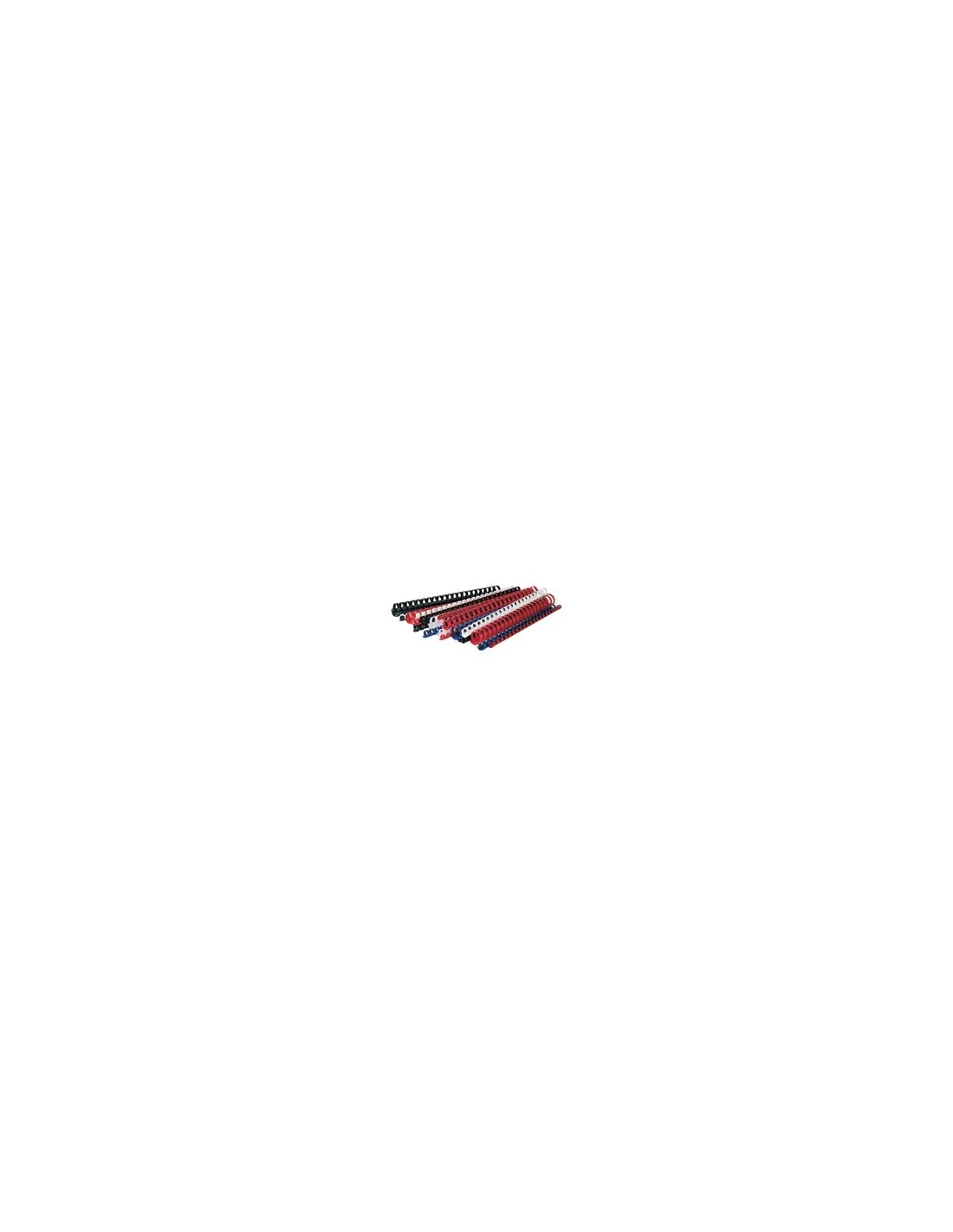 Universales para todas las máquinas . 30 cm de largo (21 anillas). Permiten un corte fácil con tijeras. 4 colores: negro, blanco, rojo, azul. Caja de 100 unidades.