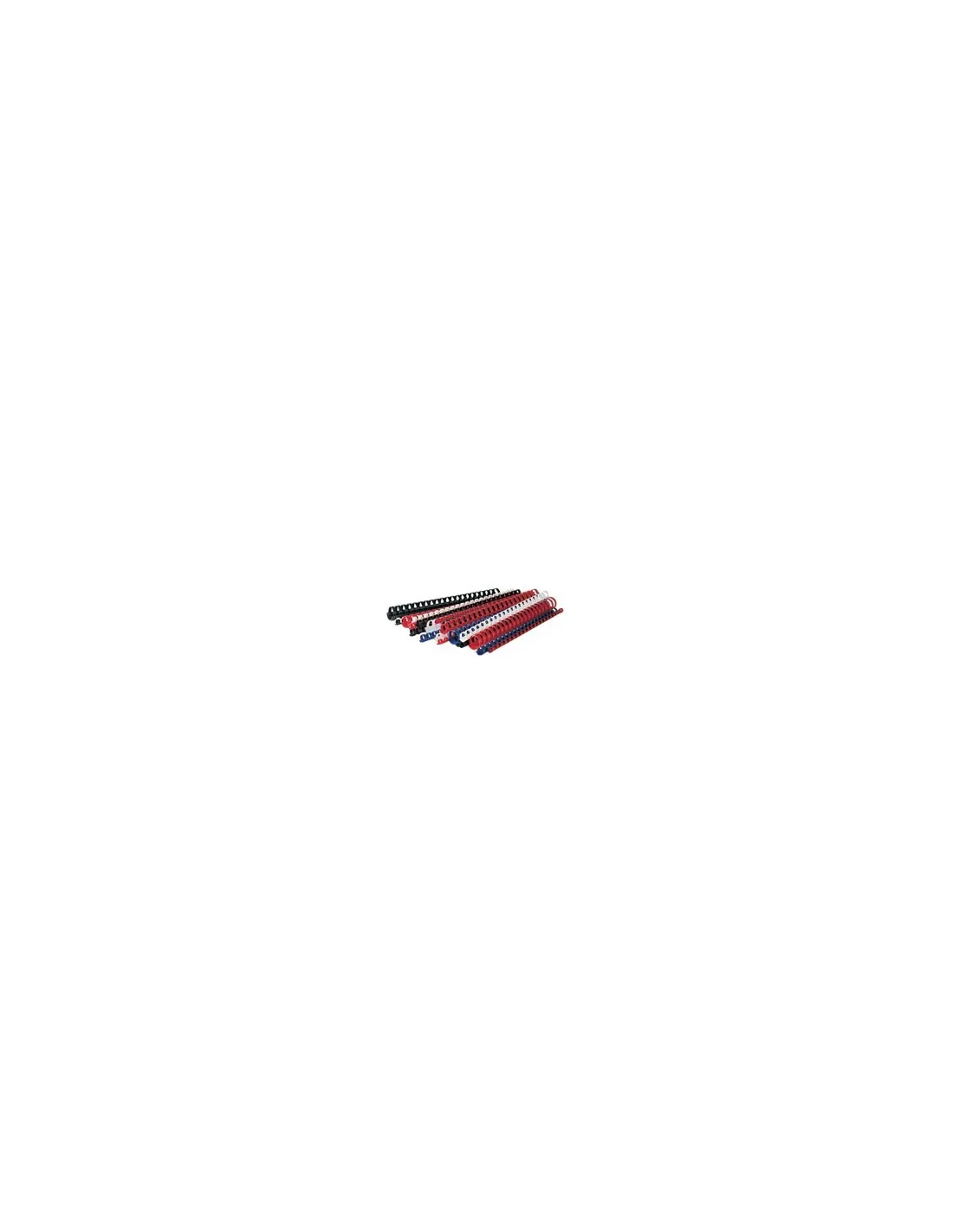 Universales para todas las máquinas . 30 cm de largo (21 anillas). Permiten un corte fácil con tijeras. 4 colores: negro, blanco, rojo, azul. Caja de 100 unidades.