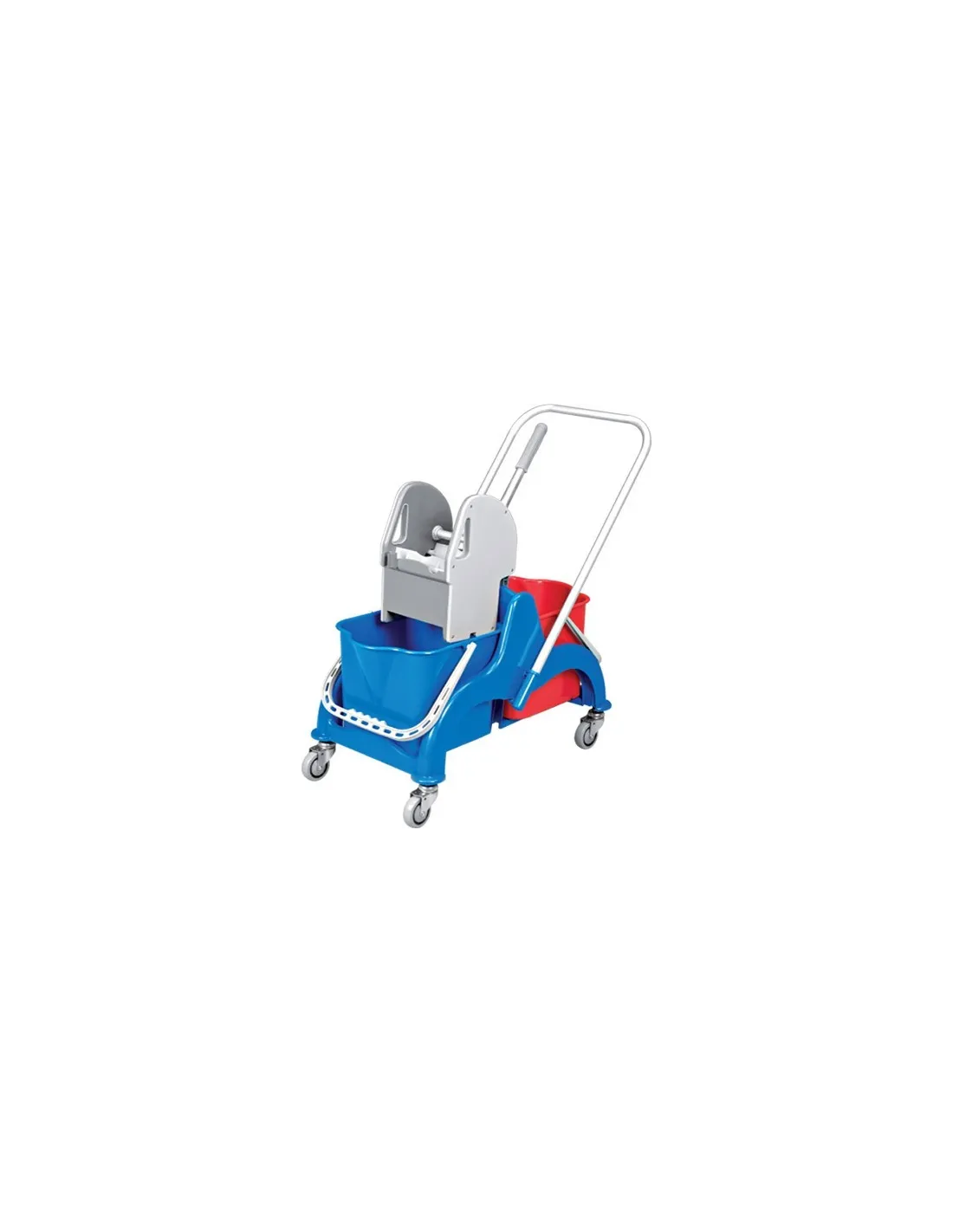 Escurridor para fregonas. 2 cubos de 18 litros. Manillar reversible. Soporte para escurridor. Ruedas multidireccionales 8 cm diámetro. Dimensiones: Alt. 87 x An. 66 x Fon. 41 cm.Carrito limpieza 2 cubos 18l
