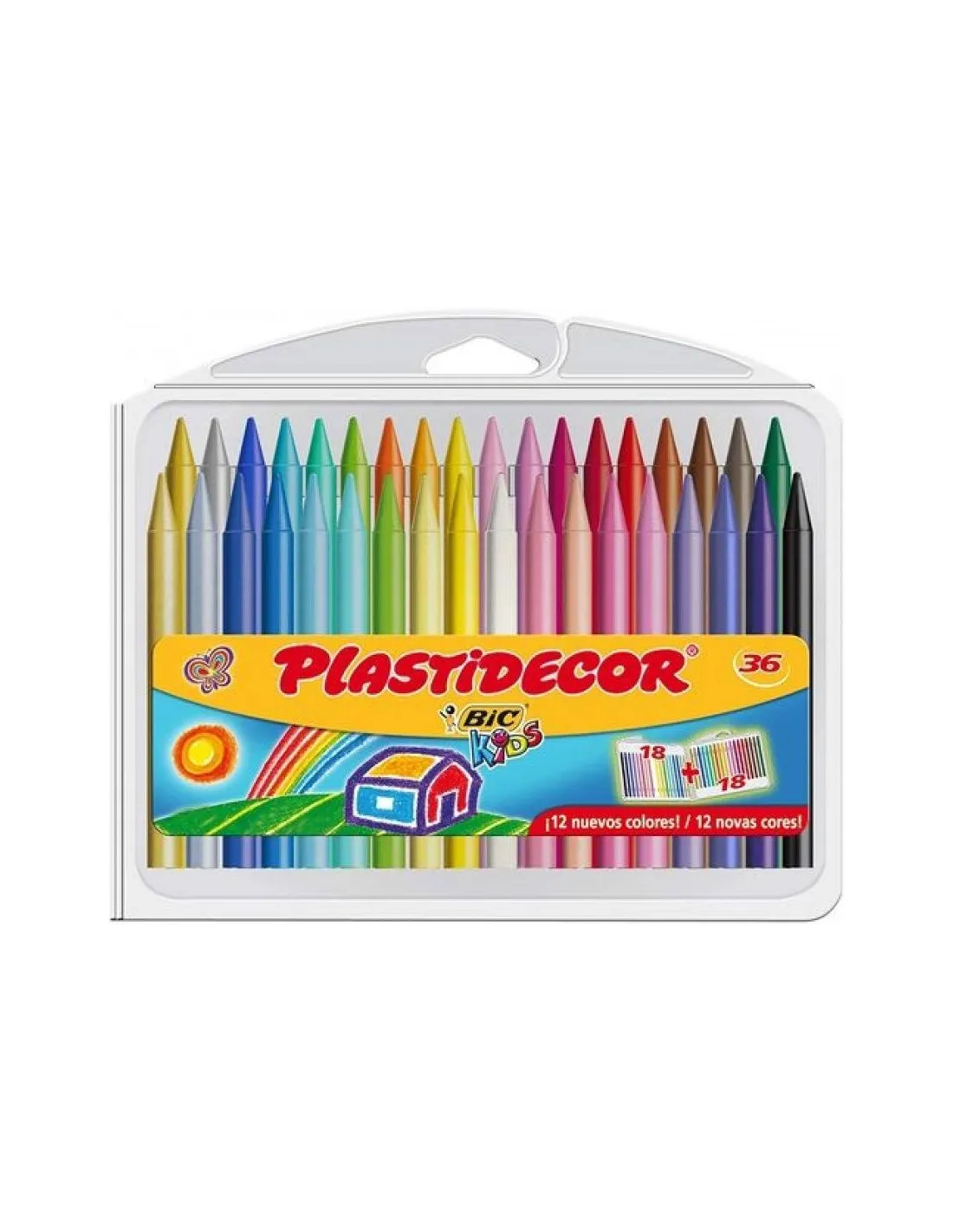 Ceras Plastidecor plásticas Bic Kids , utilizables sobre papel satinado. Se les puede sacar punta. Son borrables. No ensucian. Muy resistentes. Buena capacidad cubriente. Ceras de Colores mezclables. Estuche de 36 colores surtidos.