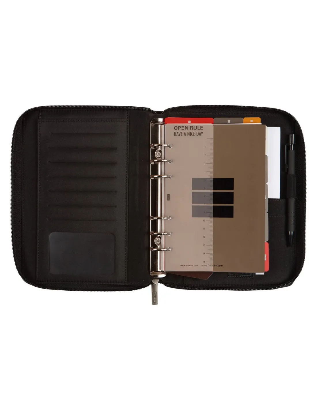 FINOCAMAgenda de anillas con mecanismo niquelado y sistema de organización fabricada en material sintético. Con departamentos para tarjetas, carnés, etc. Con bolsillo fuelle en el interior ideal para almacenar papeles. Incluye portaminas, departamento para talonario. Cierre con cremallera.