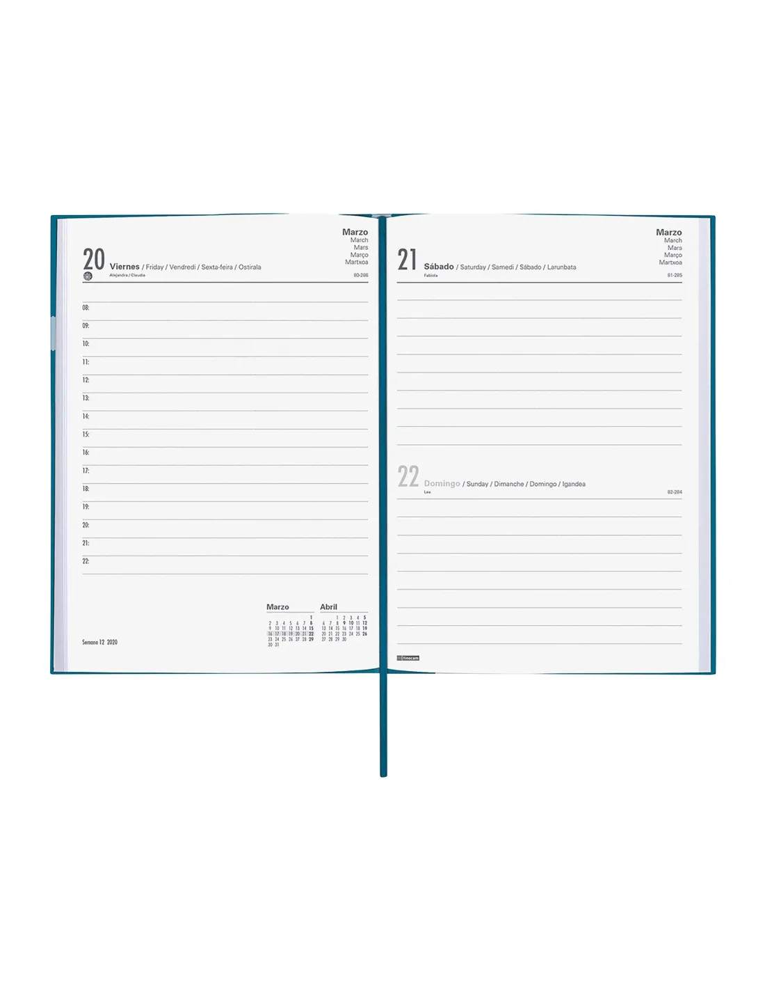Agenda profesional día por página encuadernada de estilo moderno. Tapa dura de cartón forrado con peliculado mate antirrayaduras. Apertura perfecta para poder escribir cómodamente. Con cinta punto. Esquinas microperforadas para localizar rápidamente el día/semana en curso.