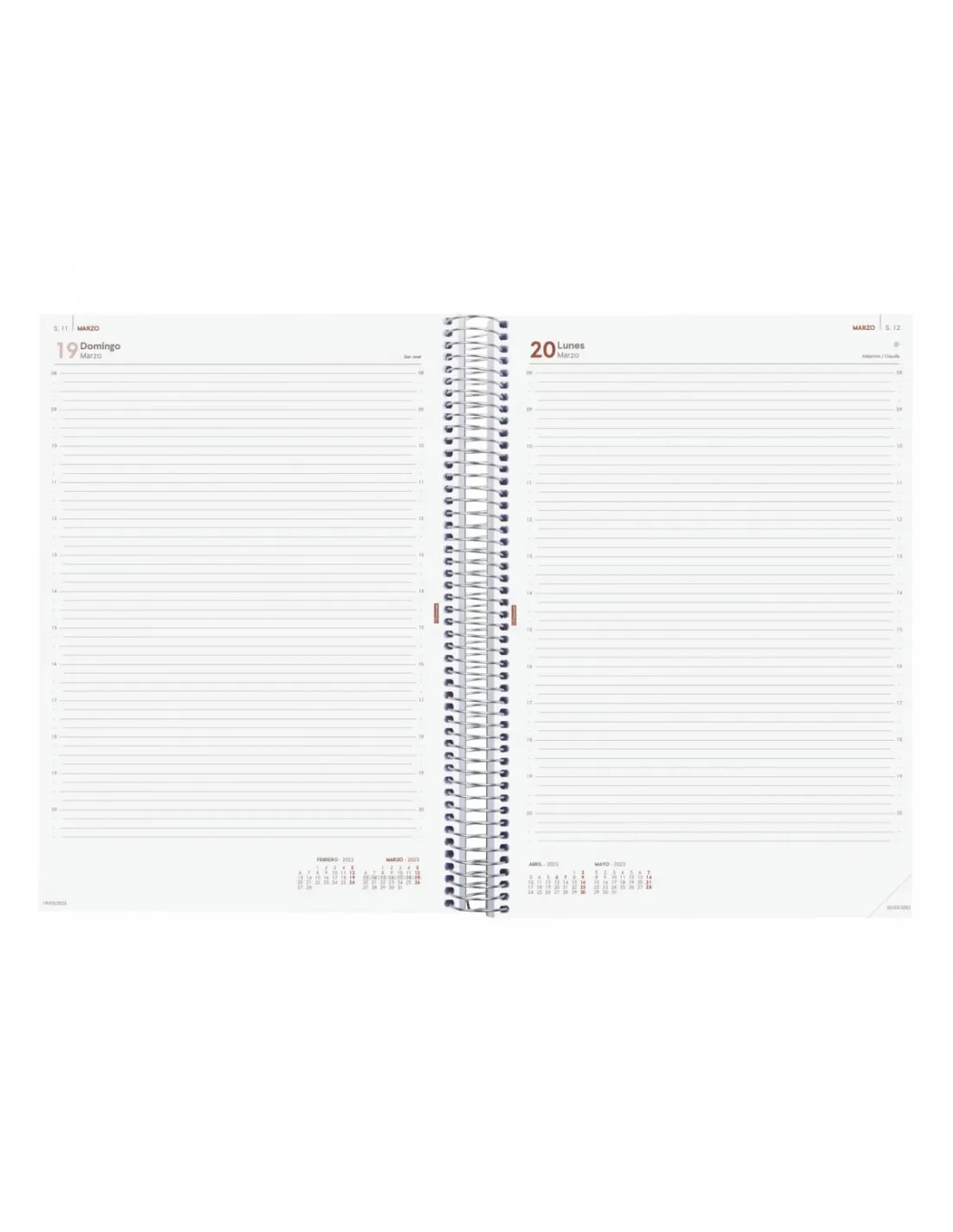 Amplio espacio de escritura para cada día. Con cuartos de hora. Sábados y domingos en página completa.