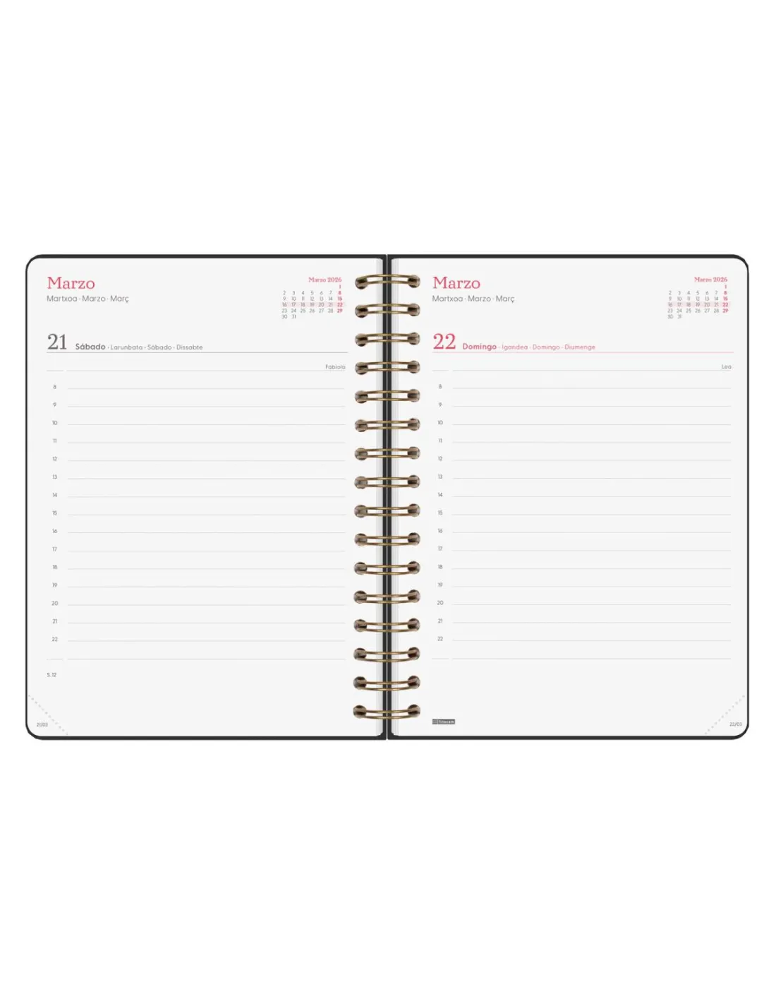 Formato similar a DIN A5; con las ventajas de una agenda portable y una de sobremesa. Amplio espacio de escritura para cada día con horas. Sábados y domingos en página completa.