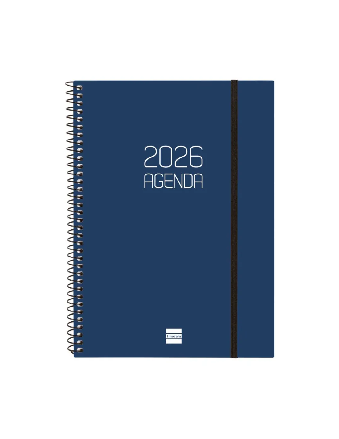 Agenda Finocam día página con tapa de polipropileno opaco, espiral simple metálica y cierre con goma elástica. Sábados y domingos en página completa.