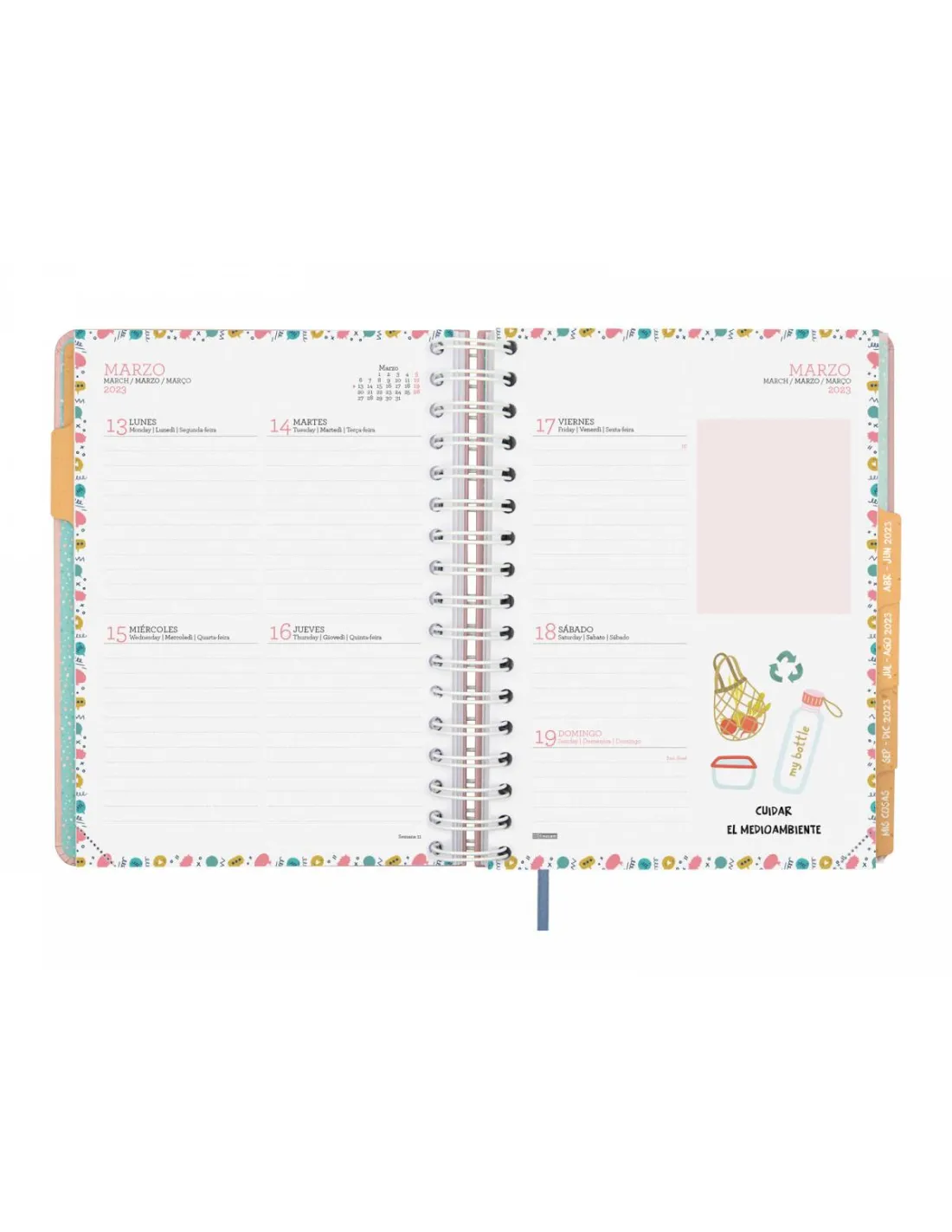 Las esquinas de la agenda son microperforadas para localizar rápidamente el día/semana en curso. El diseño interior está decorado a todo color y la anualidad dispone de planificación de cuadros al inicio de cada mes.