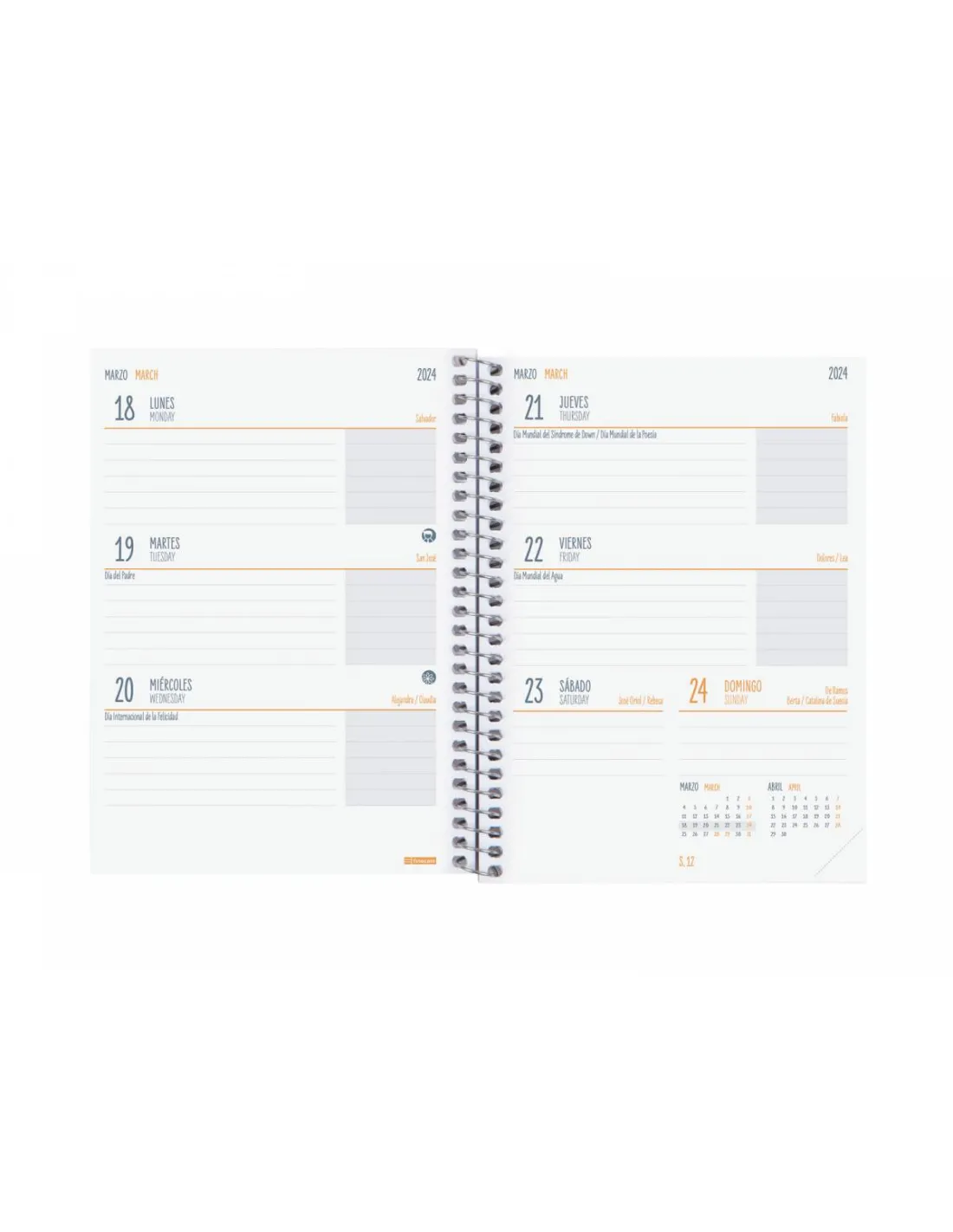 Agenda en español con anualidad bilingüe: español e inglés. Con indicación en la anualidad de los festivos de España.