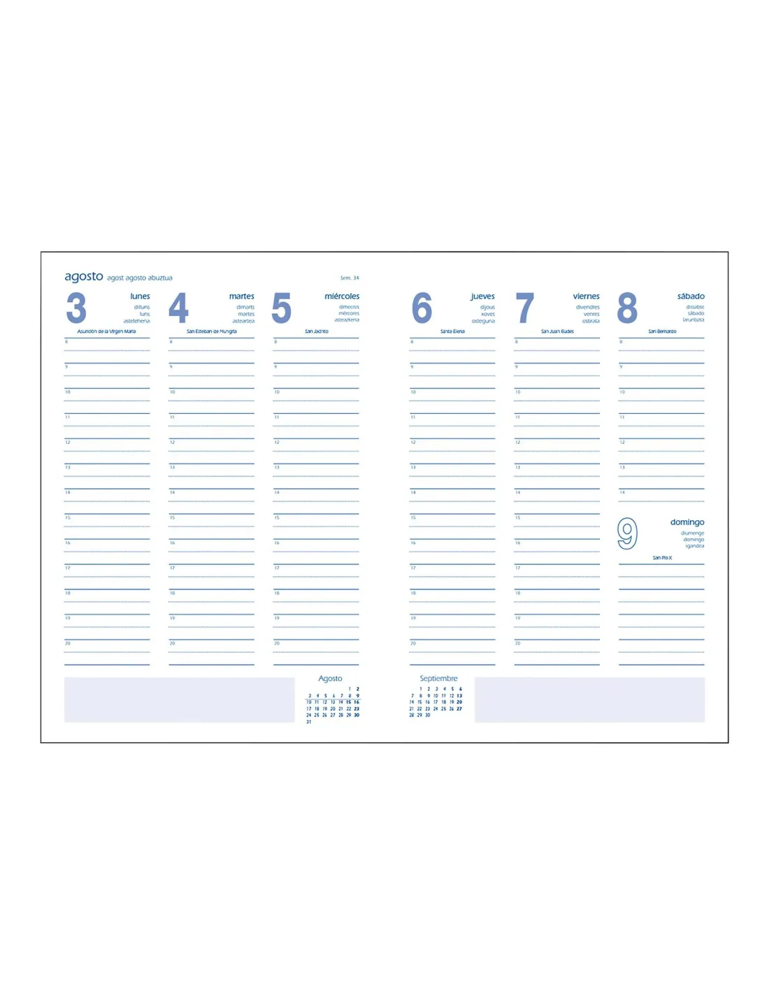 La agenda segovia con encuadernación cosida con lomo redondo, cabezada y cinta de registro color AZUL.Bloque 144 páginas, impresas a 1 color, papel Offset Blanco 70 g.Interior con Semana completa en 2 páginas, Cabeceras en 4 idiomas (Castellano, Catalán, Gallego y Euskera), Onomástica, Semana, Calendarios del mes actual y siguiente.