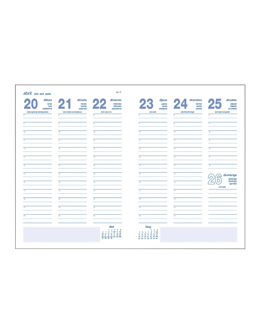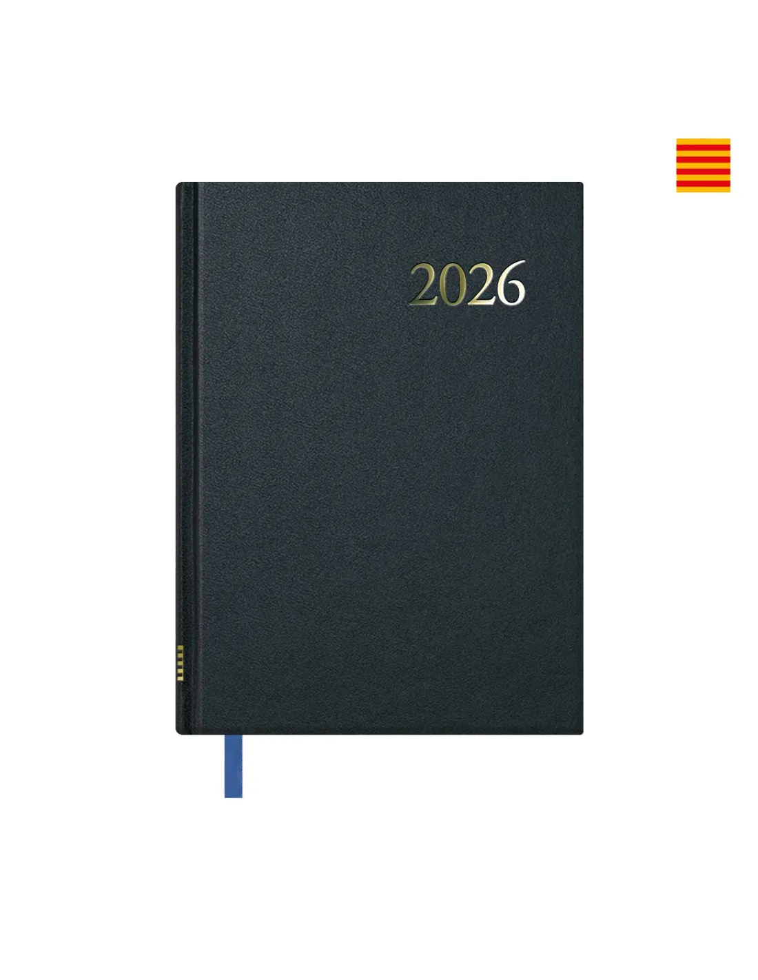 Agenda anual en Catalán. Cubierta realizada en material vinílico con cartón contracolado de primera calidad. Interior semana vista, impresa a un color en papel offset blanco de 70 g., con 144 páginas. Datos personales, Calendario trienal, Planning del año, Páginas para anotaciones y Listín.