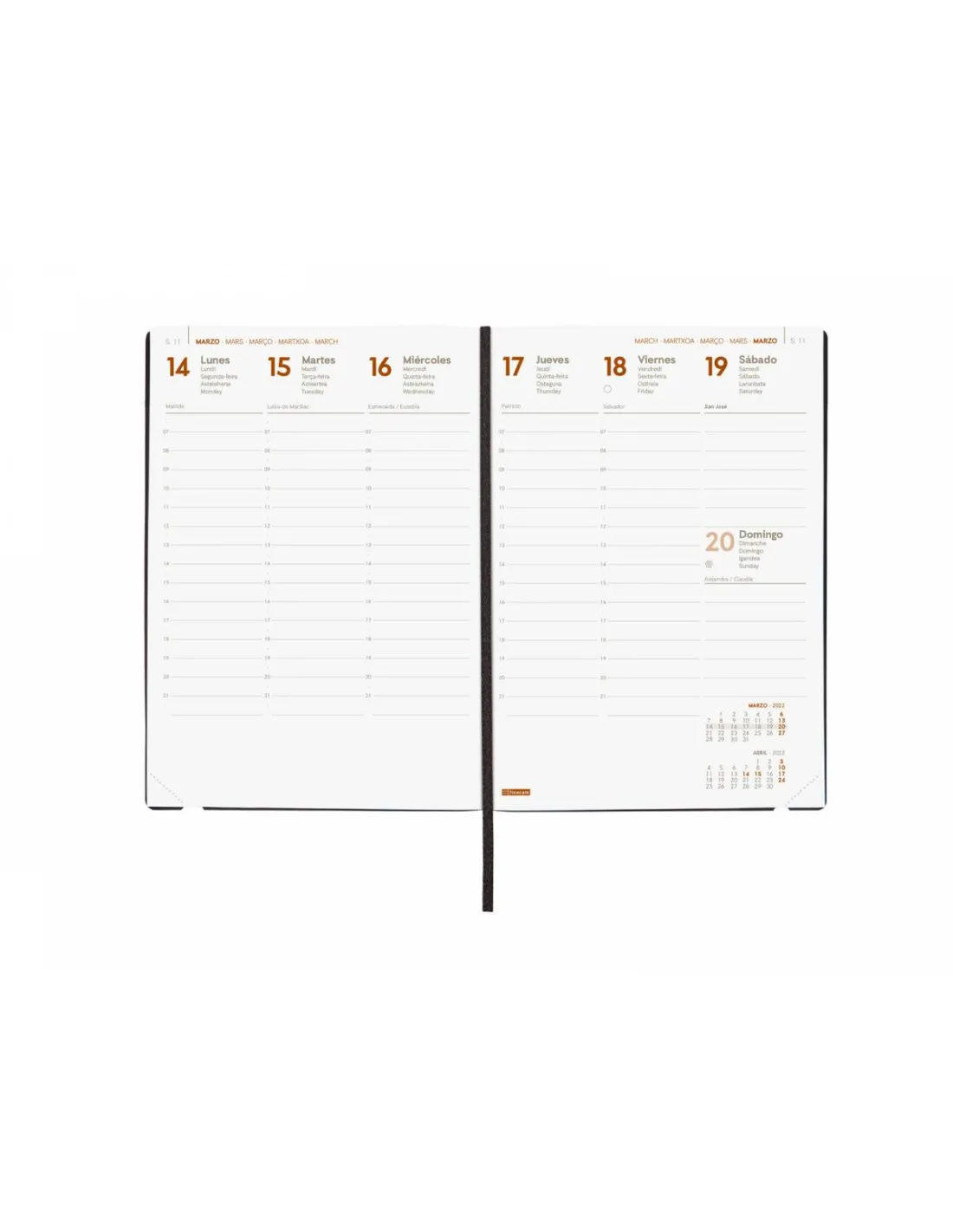 Agenda Dynamic Mara semana vista encuadernada. Formato 140 x 204 mm. Modelo Y10. Tapa fexible de tacto muy suve y gomoso. Apertura perfecta para escribir cómodamente. Con goma elástica. Anualidad multilingüe. Contenido: datos personales, horarios y calendarios, plan anual, festivos nacionales y CCAA, festivos internacionales, información útil, hojas para notas, teléfonos y direcciones mail. Papel FSC de 80 g.