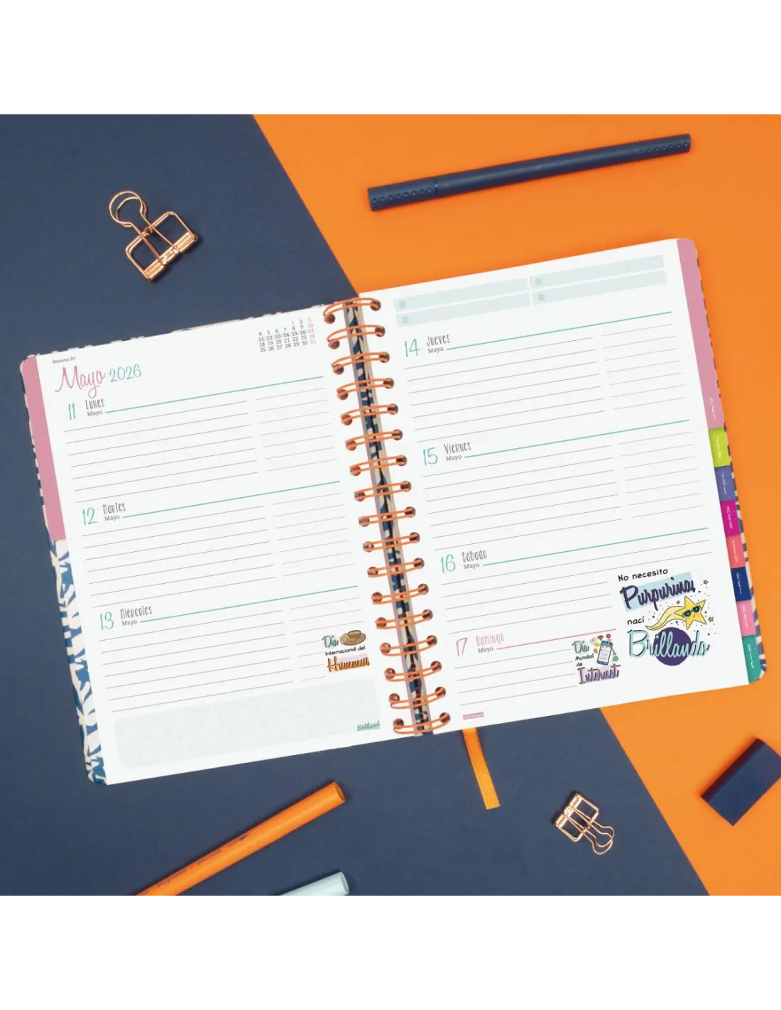 Al inicio, dispone de contenidos extra: datos personales, identidad #TALKUAL, horarios, calendarios, objetivos, planificación mensual del año en columnas y fechas para recordar. Después de la anualidad: planes, apartados para pelis, series, contraseñas y libros, hojas para anotaciones y tareas, control de notas, listas, contactos y control de ciclos. Y por último: pegatinas temáticas, funda transparente y set de notas engomadas.