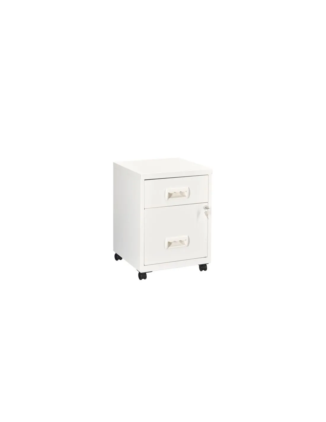 Cajonera metalica con ruedas budget 2 cajones, Estructura : Monobloc chapa de acero, acabado epoxi granulado antirayaduras. Deslizamiento cajones dezlisantes sobre guías de bolas. Cerradura ( 2 llaves incluidas). 4 ruedas multidireccionales.