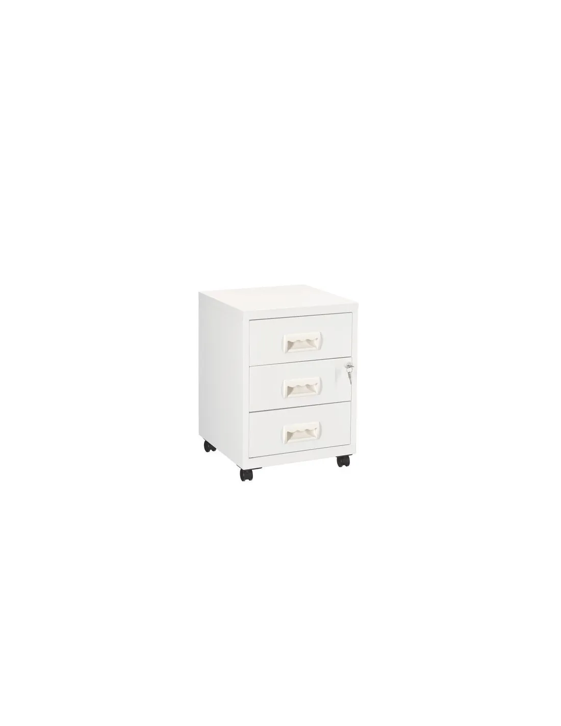 Cajonera metalica con ruedas budget 3 cajones, Estructura : Monobloc chapa de acero, acabado epoxi granulado antirayaduras. Deslizamiento cajones dezlisantes sobre guías de bolas. Cerradura ( 2 llaves incluidas). 4 ruedas multidireccionales.