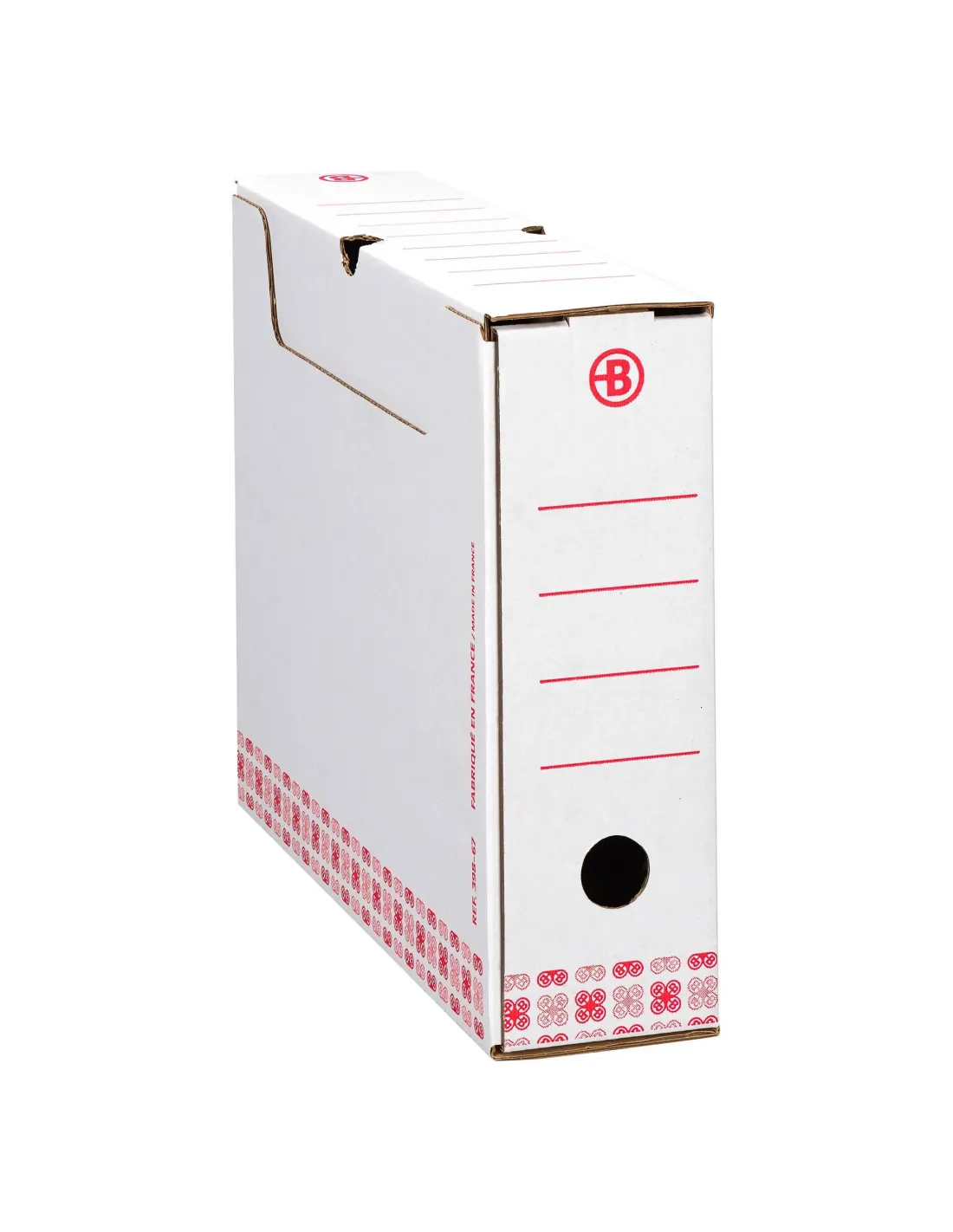 Caja de archivo definitivo Fabricadas en cartón 100% reciclado, impresión en rojo.