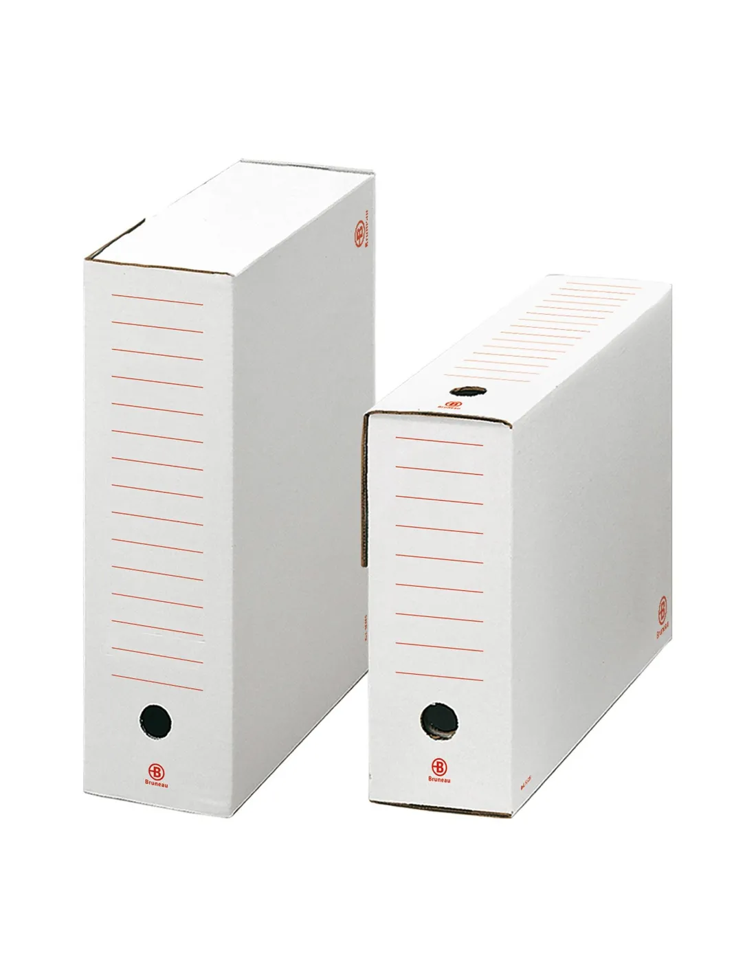 Cajas fabricadas con cartón de primera calidad. Montaje rápido y fácil. Color blanco con impresión en rojo. Con certificado FSC. Para documentos de hasta 27 x 39 cm, lomo de 11 cm