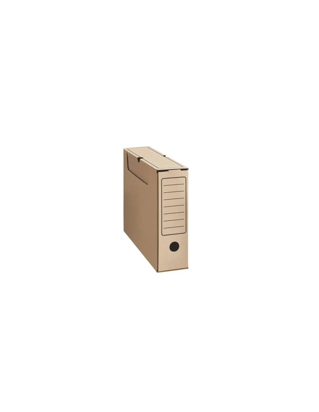 Cajas de archivo definitivo Fabricadas en cartón marrón 100% reciclado. Impresión en negro. Certificado FSC. Se entregan en plano. Fácil montaje. Para documentos de hasta 24 x 32 cm. Doble indexación. Orificios de sujeción. Dimensiones Altura 34 x Ancho 25.2 cm. Lomo de 8 cm.