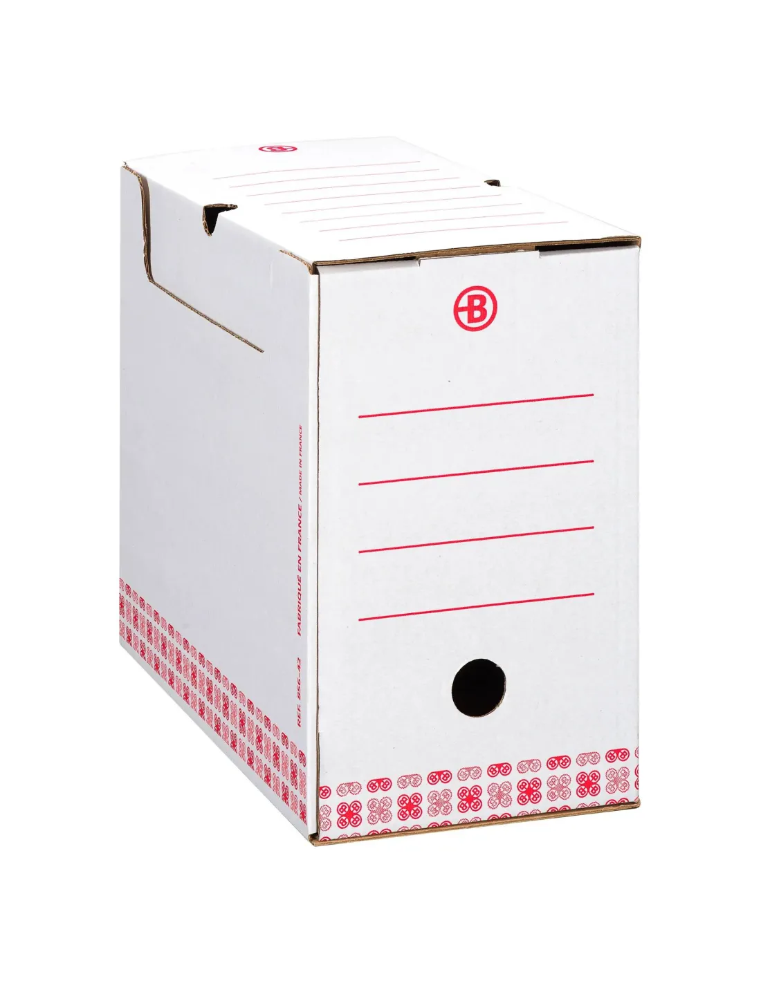 Caja de archivo definitivo Fabricadas en cartón 100% reciclado, impresión en rojo.
