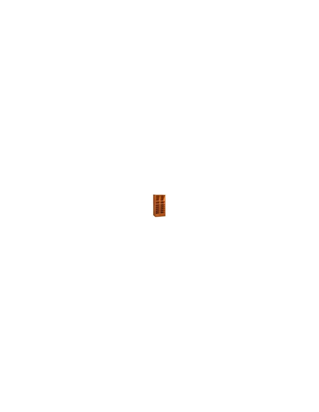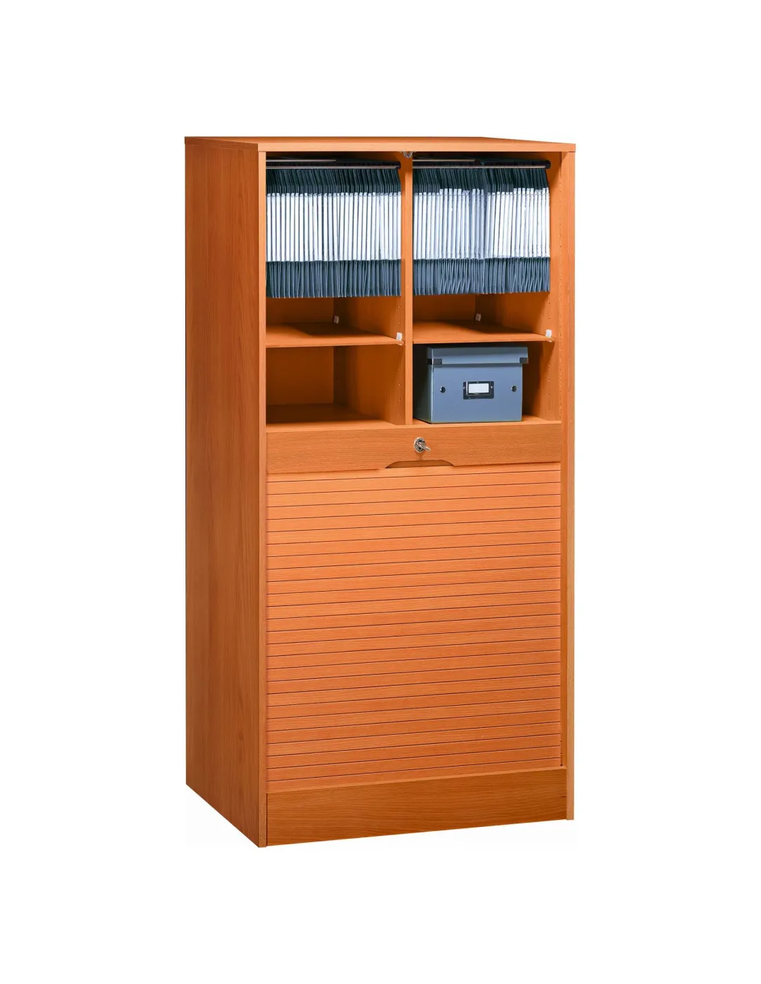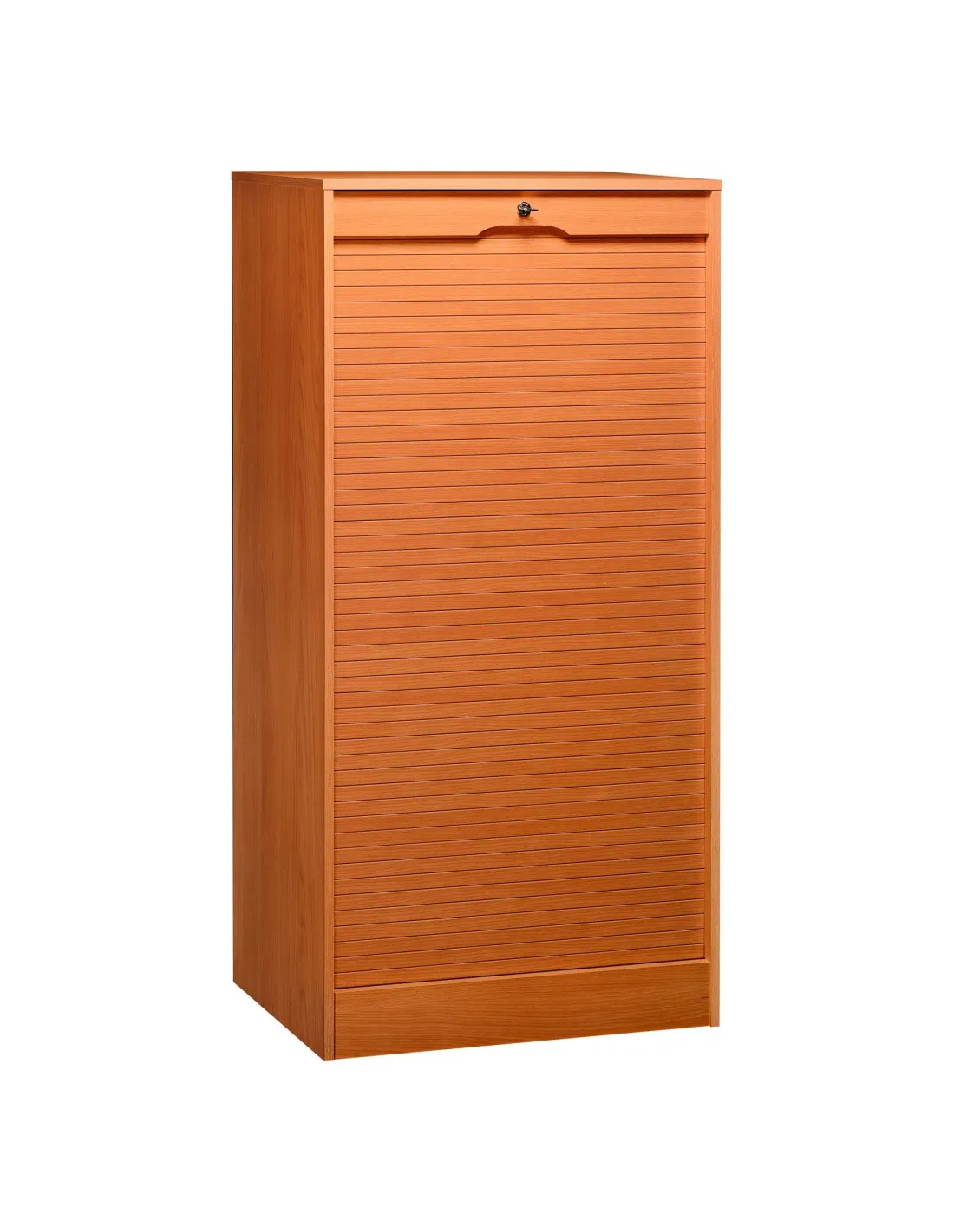 Mobiliario de oficina: Archivador de oficina madera Estructura: Paneles de partículas melaminadas espesor 16 mm. Cierre de persiana de madera, Apertura y cierre vertical. Cerradura con llave. Elementos para montar. Montaje fácil. Dimensiones: Alt. 140cm x An. 70 x Fon.44 cm. Contiene 16 baldas + 2 kit para carpetas colgantes A4.