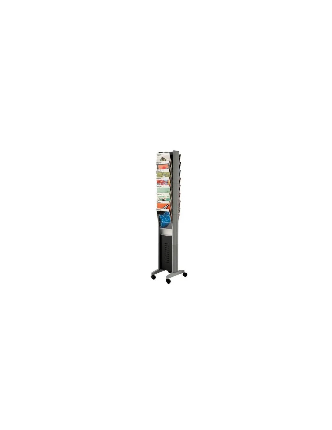 Expositor folletos con ruedas 16 casillas (8 por cara) de poliestireno transparente para documentos formato A4. Estructura de metal y poliestireno, medidas utiles casilla: altura 19,8 cm x ancho 22,5 x fondo 2,4 cm. Medidas totales Alt.167,5x30x38,5 cm, 4 ruedas pivotantes. Montaje facil sin tornillosExpositor folletos con ruedas 16 casillas (8 por cara) de poliestireno transparente para documentos formato A4.