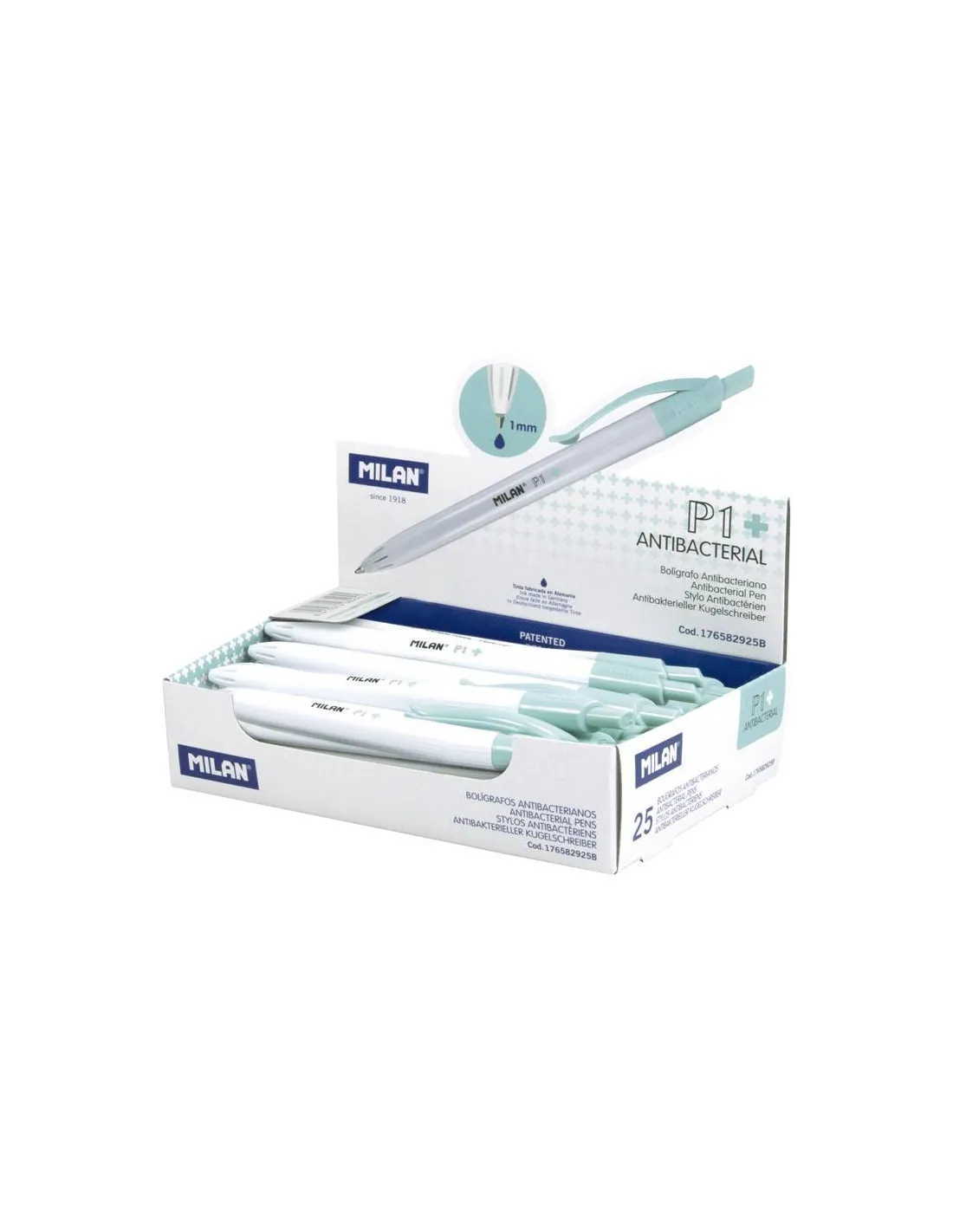 Boligrafo Milan P1 antibacteriano tinta clásica base aceite de color azul.escritura 1 mm , El cuerpo del bolígrafo contiene un tratamiento que inhibe y previene el crecimiento bacteriano, gracias a los iones de plata. Ideal para mejorar la higiene en la escuela, oficina, ambientes en contacto con alimentos y entornos sanitarios.