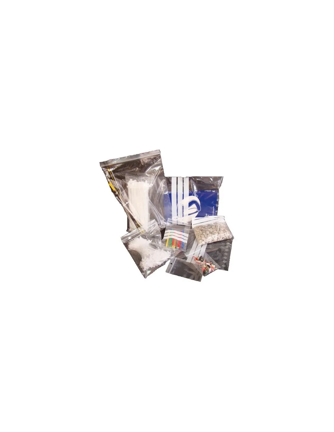 Bolsas transparente de polietileno de 50 micras. Cierre a presión. Aptas para estar en contacto con alimentos. Modelo con banda de escritura.Pack 100 bolsas 180x250 escritura