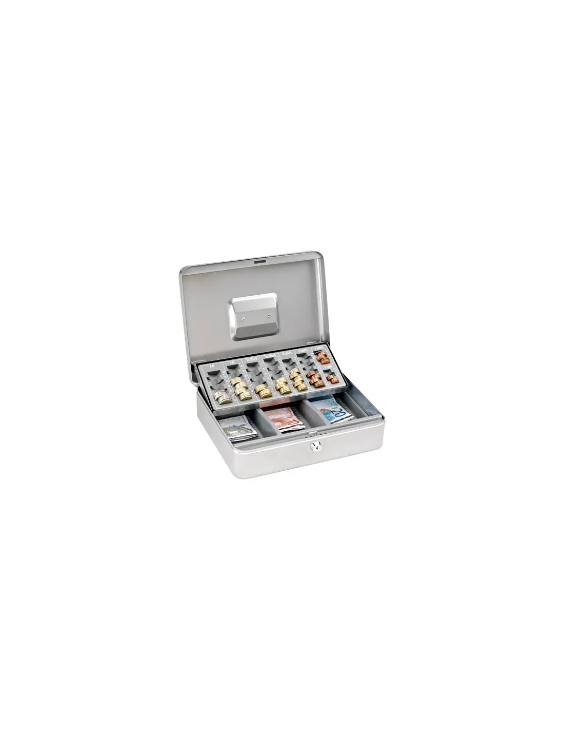 Una columna por categoría de moneda, desde 1 céntimo a 2 euros. 3 compartimentos billetes. Asa metálica integrada en la tapa. Acero 0,8 mm de grosor. Dim: An. 30 x Fon. 24 x Alt. 9 cm. Peso: 2,3 kg.Caja de caudales euro