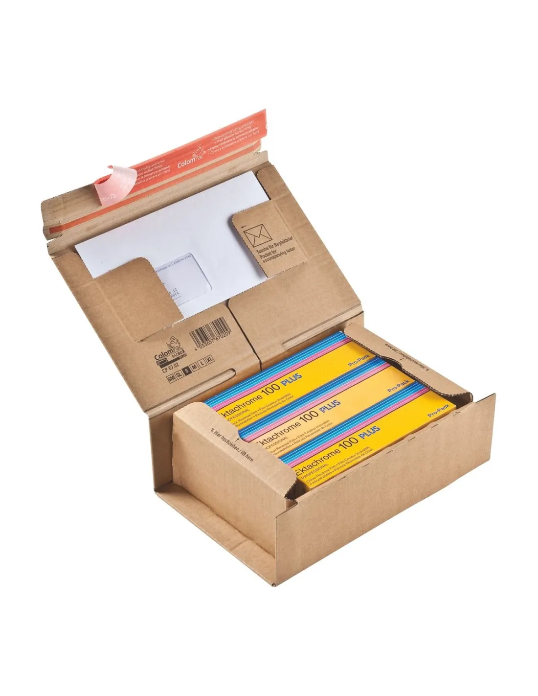 Caja postal con cierre adhesivo muy fuerte y apertura por cinta arrancable para el destinatario para una mayor confidencialidad.