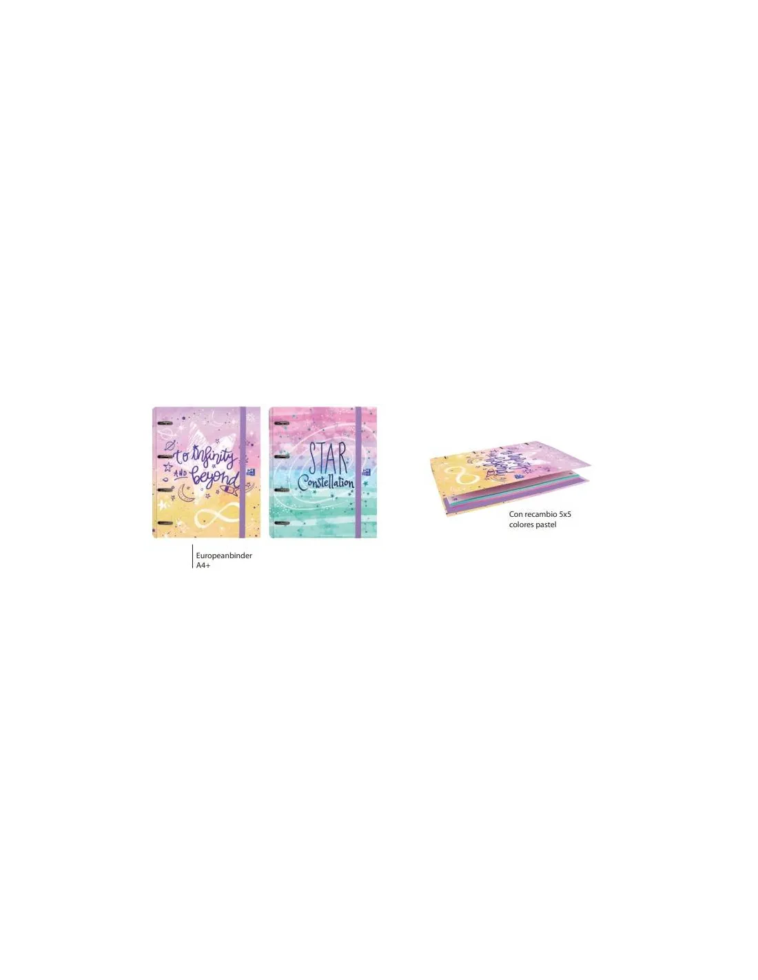 Lomo ergonómico que permite transportarlo de forma cómoda Cierre con goma elástica a juego Guarda a juego Recambio con papel Optik Paper® 90 gr, extra resistente, la tinta no traspasa Se pueden archivar separadores y fundas A4 Recambio compatible con la aplicación gratuita SCRIBZEE CARACTERÍSTICAS Carpeta de 4 anillas A4+ con recambio Goma y guarda de color malva Recambio 100 hojas con cuadrícula 5x5 con 5 colores de banda pastel Tapas de la carpeta con acabado mate Capacidad para 250 hojasEuropeanbinder GALACTIC PASTEL: una carpeta con recambio un diseño para ir hasta el infinito y más allá. Una colección inspirada en la galaxia en tonalidades pastel. Incluye un Recambio 100 Hojas con cuadrícula 5x5 con 5 bandas de color pastel con papel 90 gr OptikPaper®. Compatible con Scribzee®. Cierre con goma y guarda a juego con la tapa. Podrás llevarla dónde quieras cómodamente gracias a su lomo ergonómico. Tapas extraduras para proteger todas tus hojas. Tiene ancho especial para incorporar separadores y fundas. Diseños surtidos, se sirven aleatoriamente