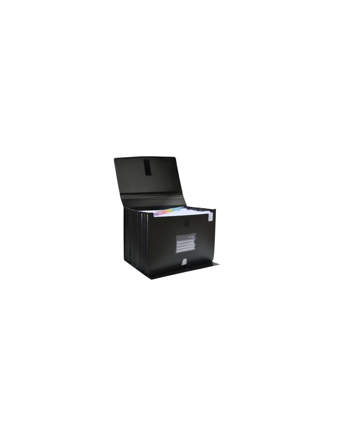 Clasificador acordeon Office Box con fuelle extensible polipropileno, Fuelle transparente. Incorpora 12 divisiones con etiquetas de cartón en colores de clasificación y 2 portatarjetas personales. Polipropileno, con cierre y base Velcro. Medidas: 330 mm de largo x 240 de alto.Fuelle extensible 40cm Color: Negro.