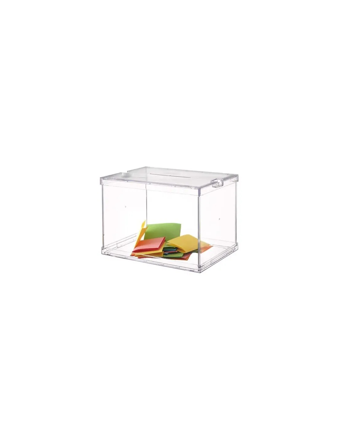 Urna electoral plegable modelo oficial. Fabricada en poliestireno en color cristal transparente, con base de color blanco. Medidas ranura: 180x8. Incluye 2 precintos de seguridad.Medidas: Alt.31.5 x An.44 x Fon.31 cm.Urna electoral plegable modelo oficial. Fabricada en poliestireno en color cristal transparente, con base de color blanco. Medidas ranura: 180x8.