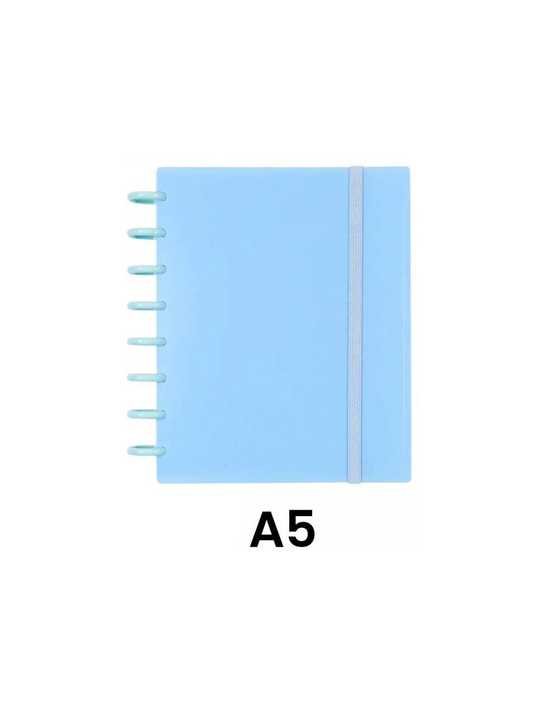 Cuaderno con 100 hojas de papel 100 gr calidad extra , goma elástica a juego y discos de plástico de 30 mm. ·