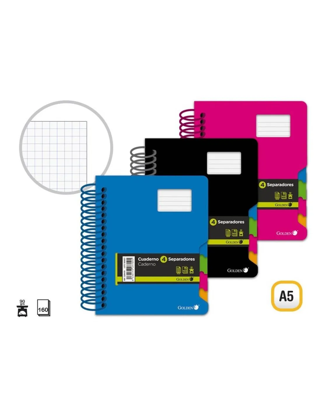 Bloc económico A5 Golden que incorpora 4 separadores para una mejor organización de tus notas este cuaderno de 160 hojas con cuadrícula de 5x5mm es ideal tus notas.