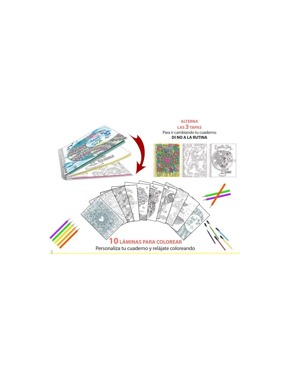 ¡Personaliza tu cuaderno y hazlo único! Gracias a sus láminas para colorear que se convierten en tapas y contratapas, podrás personalizar tu cuaderno y relajarte al mismo tiempo. No habrá 2 cuadernos iguales, ¡Personaliza el tuyo!