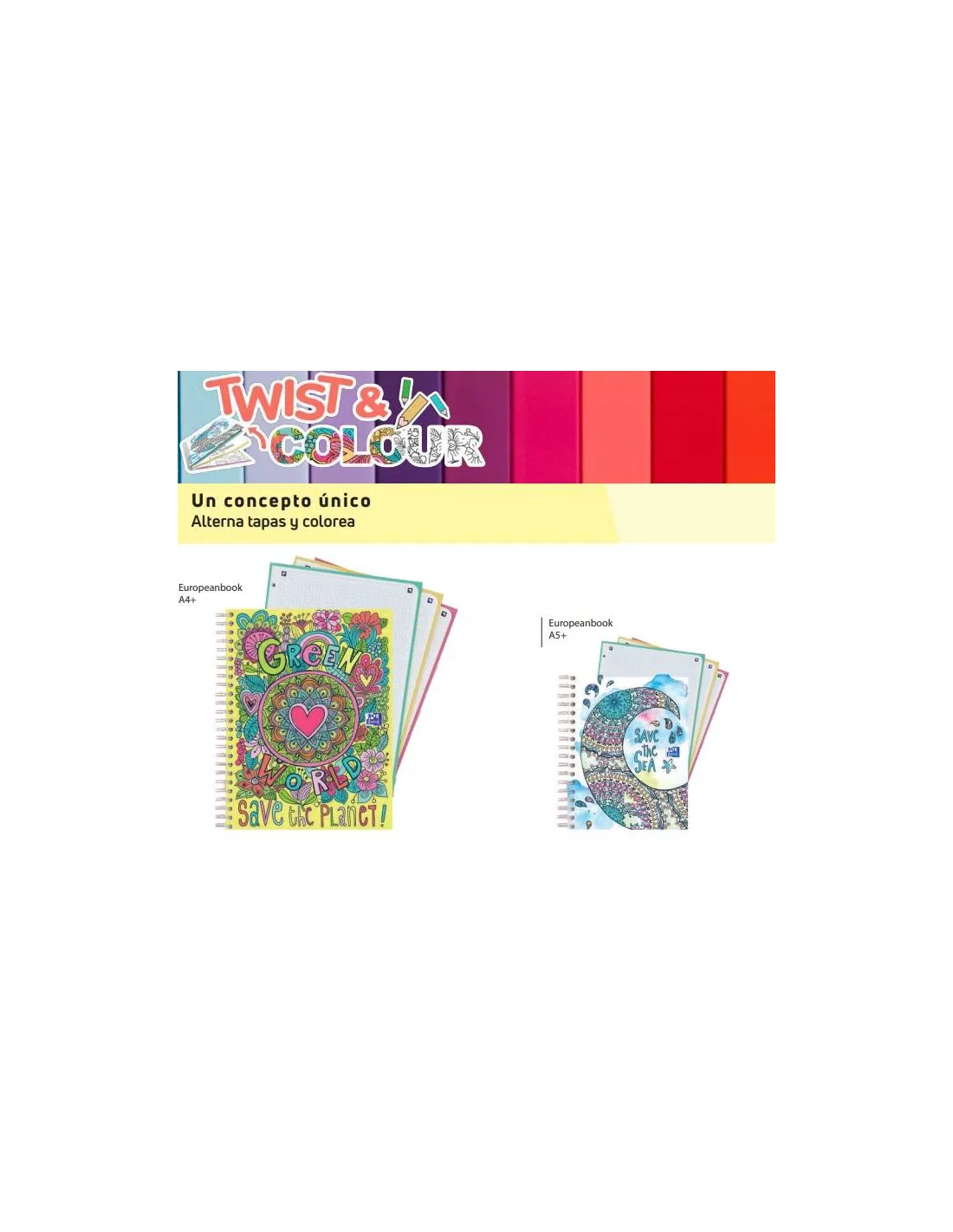 Espiral doble wire-o en color blancoEl EUROPEANBOOK TWIST&COLOUR es un cuaderno 2 en 1. Un concepto único, de cuaderno y personalización. Ésta cuaderno cuenta con 120 hojas microperforadas, divididas en 3 secciones de color. Entre cada sección, incluye láminas de cartulina artística, con mandalas e ilustraciones en blanco y negro para colorear. Además, gracias a su espiral doble, podrás cerrar el cuaderno por una de sus secciones centrales, de manera que puedas alternar las diferentes tapas, coloreándolas a tu gusto. ¡Di no a la rutina! Relájate coloreando tu cuaderno y comparte tus creaciones con el hashtag #OxfordTwistandColour. Además, éste cuaderno es compatible con la aplicación gratuita SCRIBZEE que te permite escanear, compartir, organizar o consultar tus notas donde quieras con tu smartphone. Formato A4+.Diseños surtidos, se sirven aleatoriamente