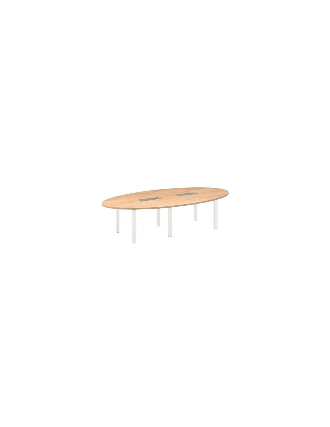 Mesa reunion modular Eden, formada po 2 tableros semiovalados con 1 caja pasacables en cada parte para poner regleta. Estructura de tablero de paneles de particulas melaminadas, grosor 25 mm