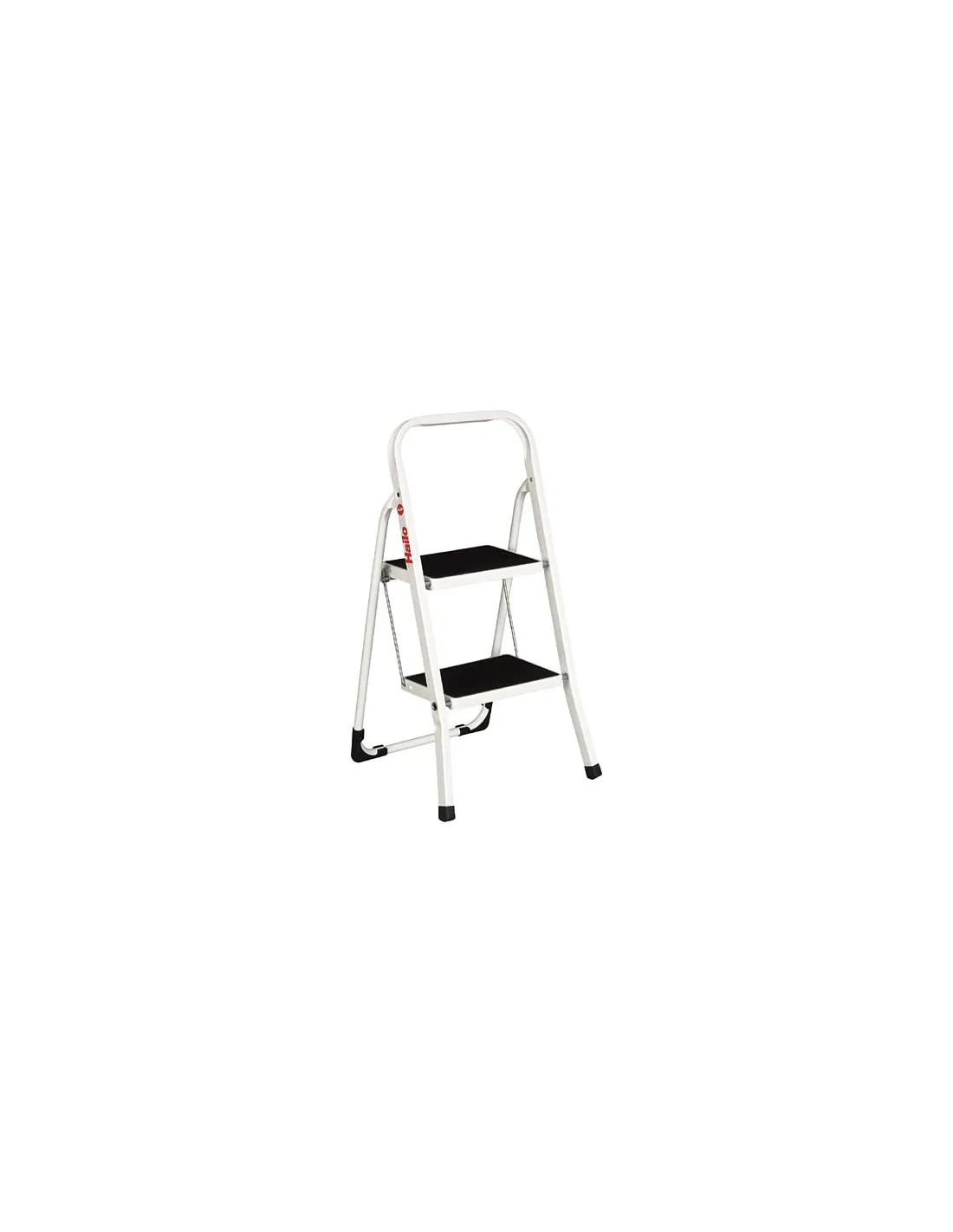 Montantes de tubos de acero lacado epoxi blanco. Escalones de 20 x 30 revestidos de plástico negro antideslizante. Grosor plegada 4,5 cm. Ancho 47 cm.2 peldaños. 4,8 kgMini escalera gana espacio 2 peldaños