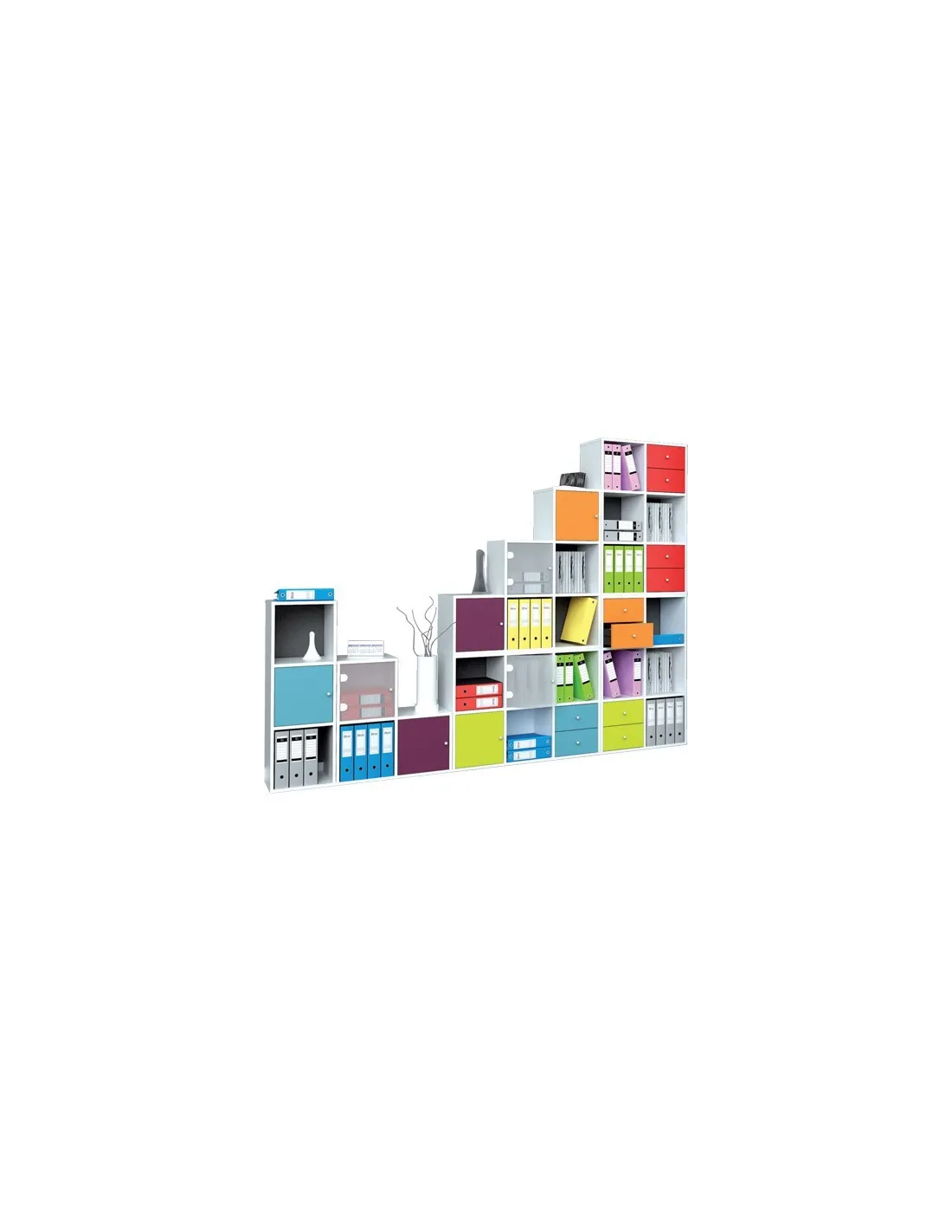 Posibilidad de adaptar puertas o bloques de cajones en 5 colores a elegir. Cada módulo se entrega con un fondo de casilla que asegura la rigidez de la estantería.