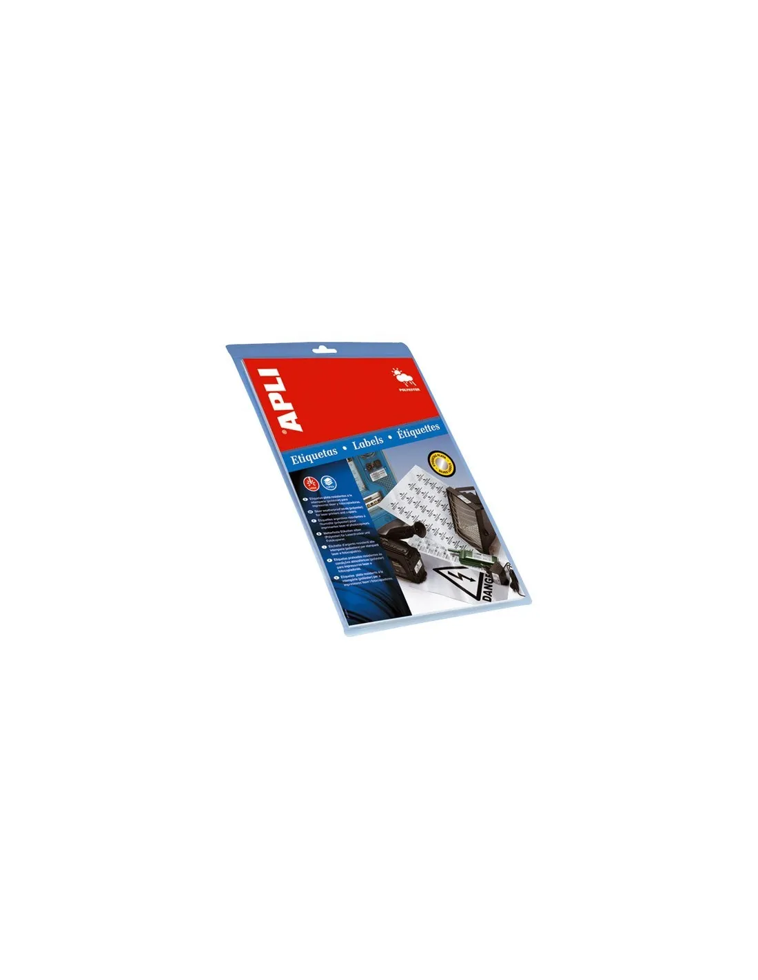 Etiquetas blancas cantos rectos tamaño 210,0 x 297,0 mm con adhesivo permanente. Blister con 20 hojas (20 etiquetas). Poliester blanco con acabado mate resistentes a la intemperie y a la corrosión ambiental. La etiqueta de poliéster soportan condiciones extremas, resistiendo temperaturas de entre -20°C hasta +100°C. Ideales para marcaje de elementos y señalizaciones exteriores, así como envíos. Excelente calidad de impresión en impresoras láser o fotocopiadoras.