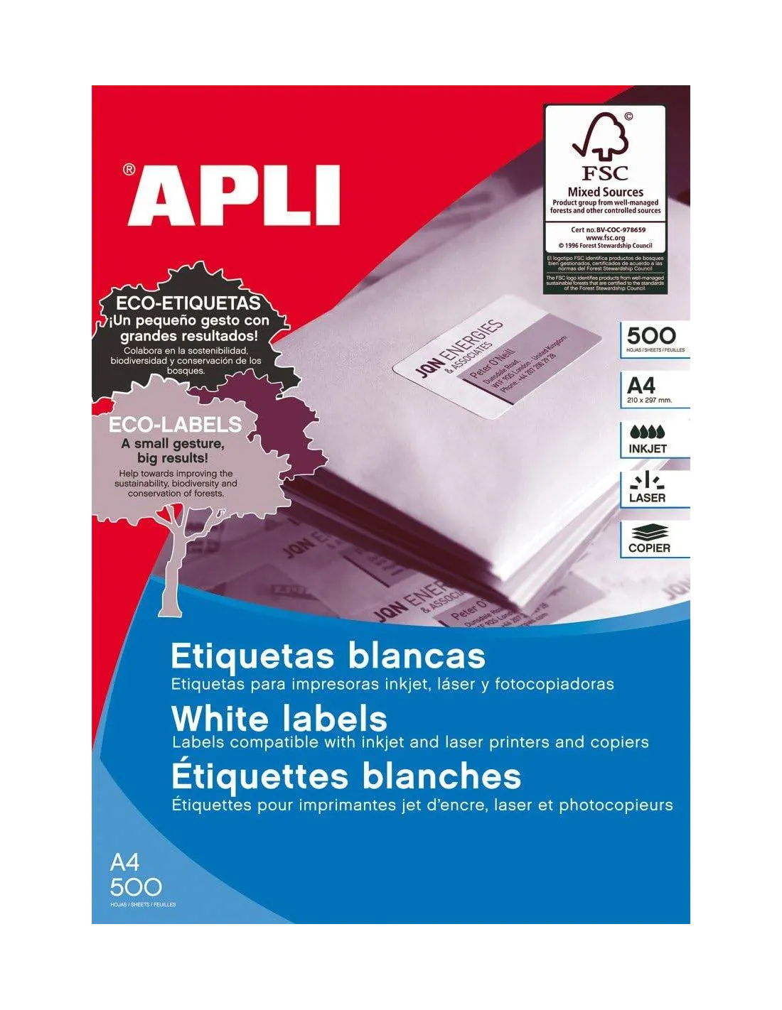 Caja con 500 hojas Apli perfectas para identificar envíos de correspondencia, objetos, paquetería o para clasificar. Excelente calidad de impresión en impresoras inkjet, láser o fotocopiadoras.