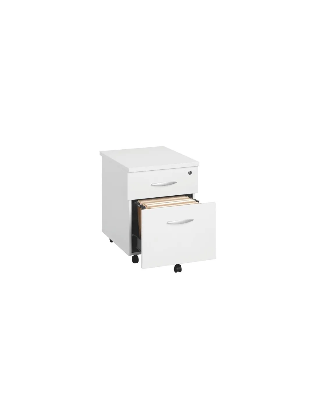 Cajonera madera para debajo de la mesa fabricada en tablero de paneles de partículas con revestimiento melaminado antirayaduras y antireflejos grosor 19 mm. Cierre centralizado (incluye 2 llaves). Tirador metálico color aluminio.