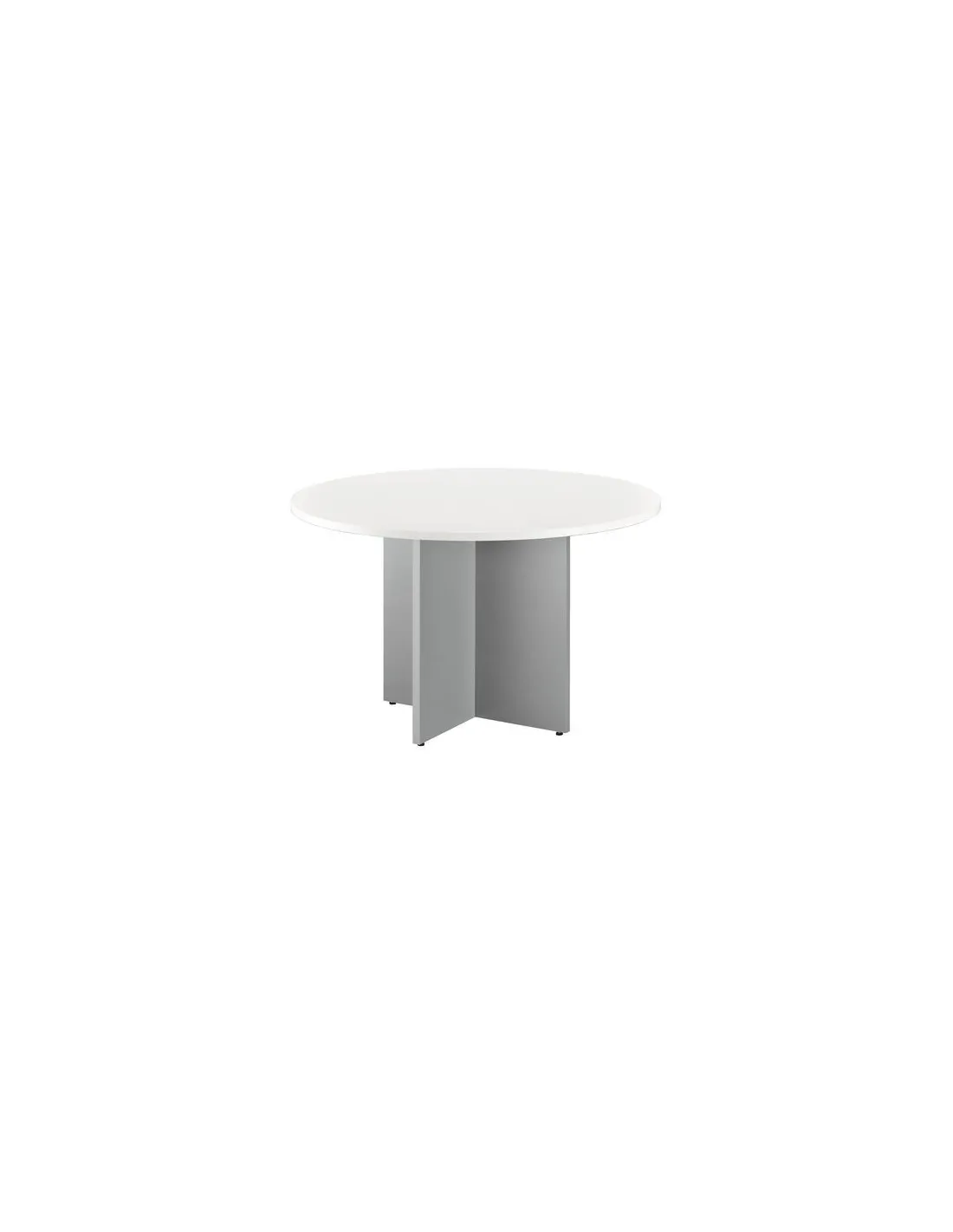 Mesa de oficina redonda fabricada de tablero de paneles de partículas de melamina de alta densidad, 25 mm de grosor, cantos de PVC antichoque de 3 mm. Patas en cruz de paneles de partículas melaminadas.