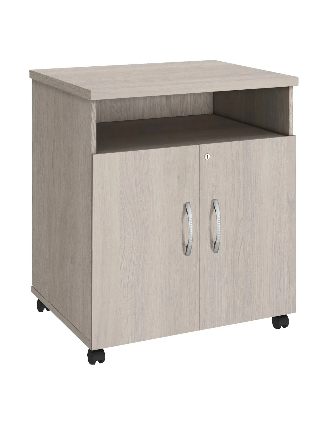 Mueble auxiliar de madera con ruedas para oficina Excellens puede soportar hasta 80 Kgs, ideal para poner impresoras, fotocopiadoras de mesa u otras máquinas esenciales para tu oficina Mueble de oficina de estructura de madera partículas melaminadas. Especialmente adaptado para cargas pesadas hasta 80 kg con 4 ruedas de las cuales 2 tienen freno para una mejor seguridad. Medidas totales del mueble : Alt 77 x An 67 x Fon 52 cm. Medidas Utiles: An 63 x Fon 47 cm