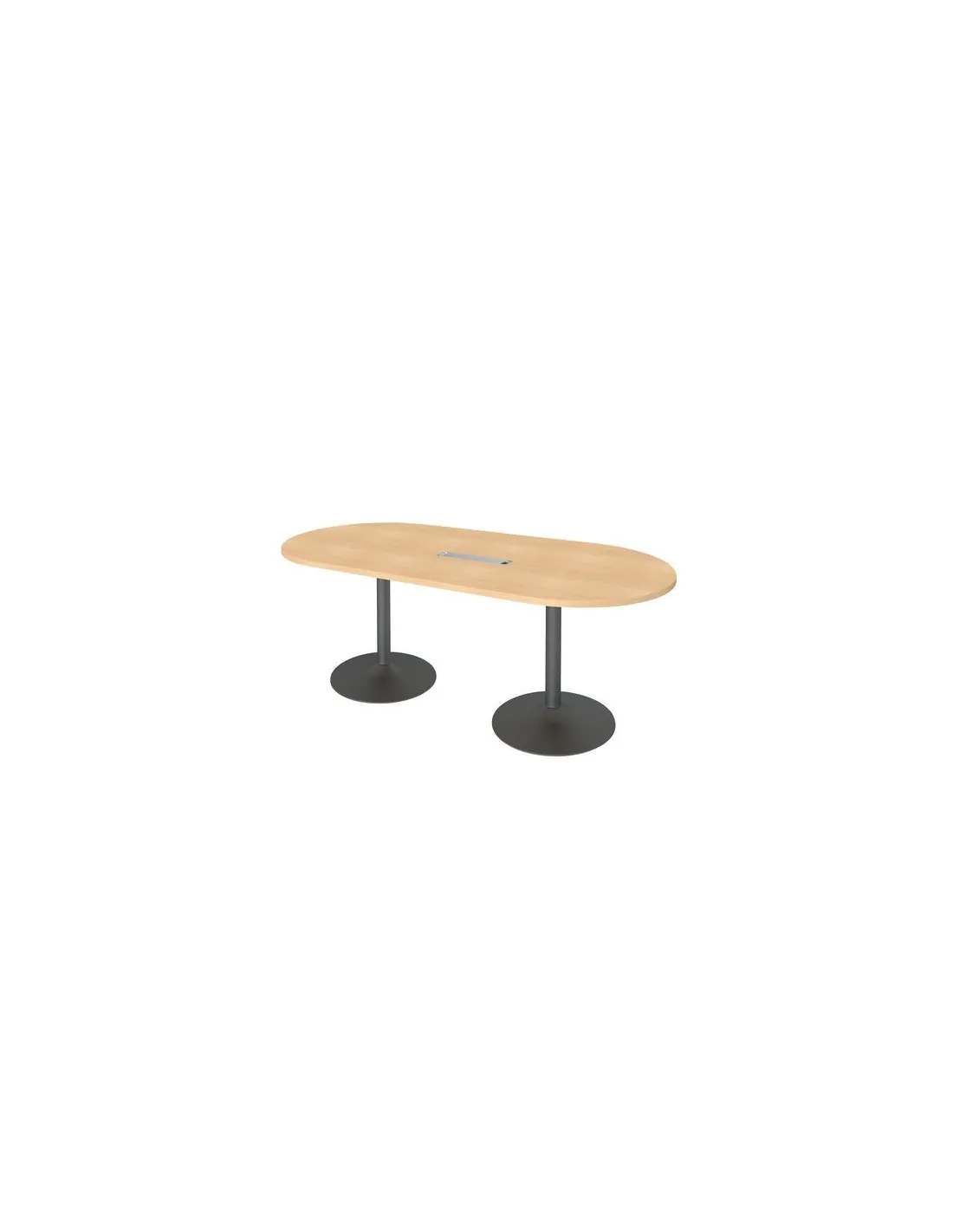 Mesa de reunión ovalada tablero único de madera Excellens , tablero de partículas de melanina de alta densidad con un grosor de 25mm, pasacables plástico rectangular color aluminio integrado en el tablero