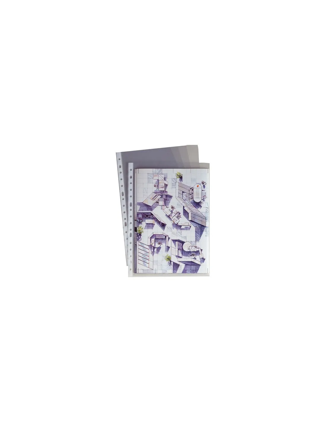 Funda folio con 16 taladros. Apertura superior. Banda de refuerzo integrada. Polipropileno transparente.Fundas multitaladro fabricadas en polipropileno extra liso folio 65 micras Caja de 100 fundas protegedocumentos para archivo.