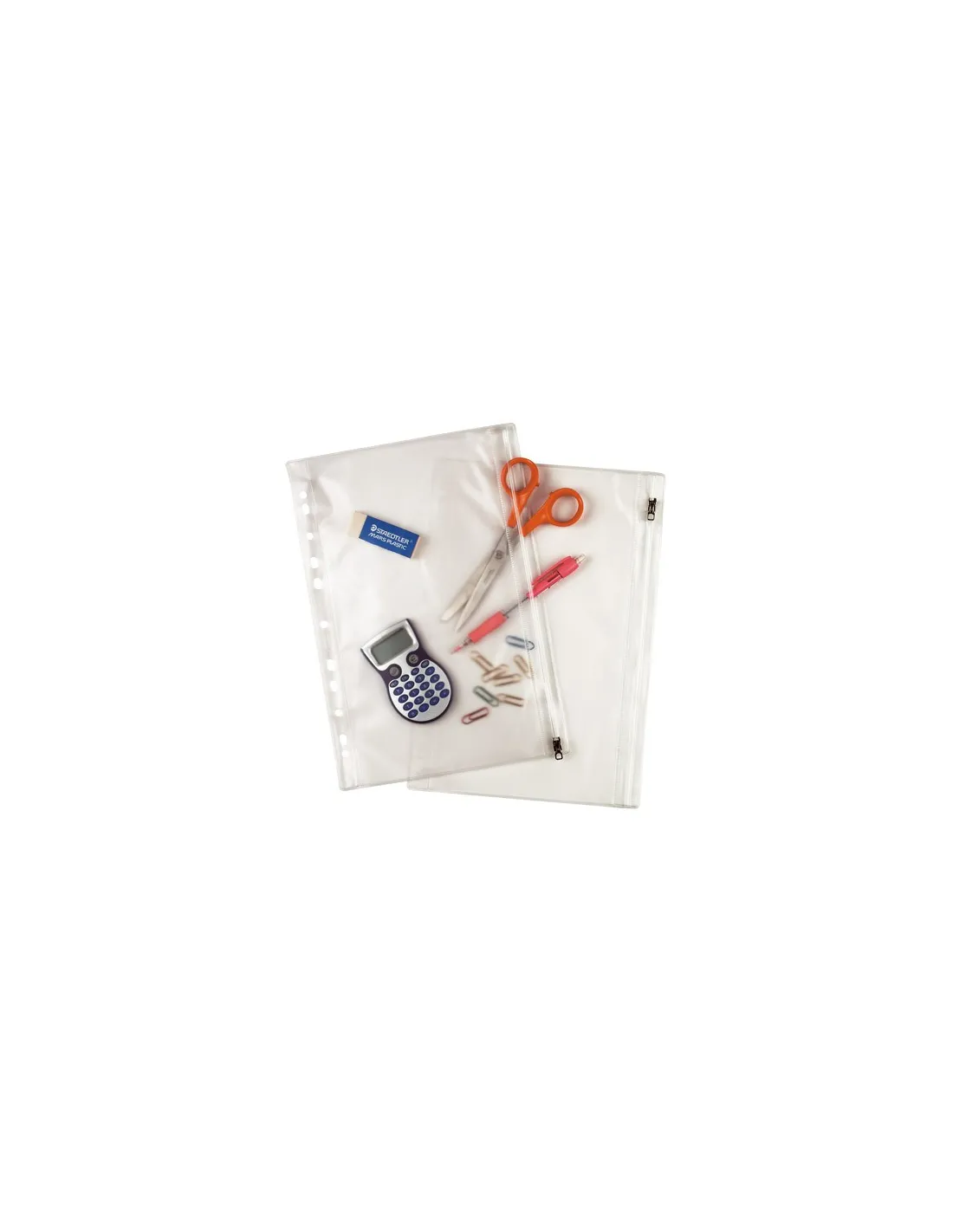 Fabricadas en PVC extraliso de 140 micras. Tamaño A4, 11 taladros. Para introducir todo tipo de documentos o complementos: tijeras, bolígrafos, calculadora Cierre mediante cremallera ZIP.
