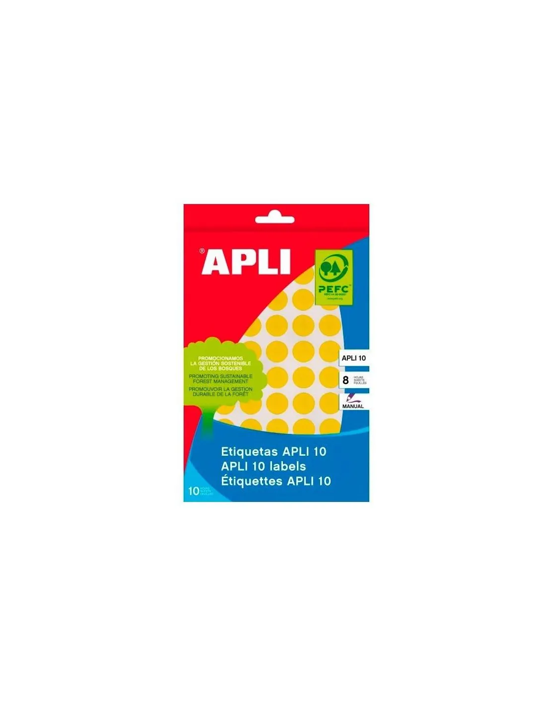APLIEtiquetas circulares en formato APLI 10, tamaño Ø 13 mm con adhesivo permanente. Pack con 8 hojas (616 etiquetas). Etiquetado rápido y efectivo sin necesidad de pasar por la impresora. Las etiquetas ideales para escribir sobre ellas con lápiz, bolígrafo (incluso tinta gel) o rotulador permitiendo un rápido secado de la tinta. Aptas para escritura manual.