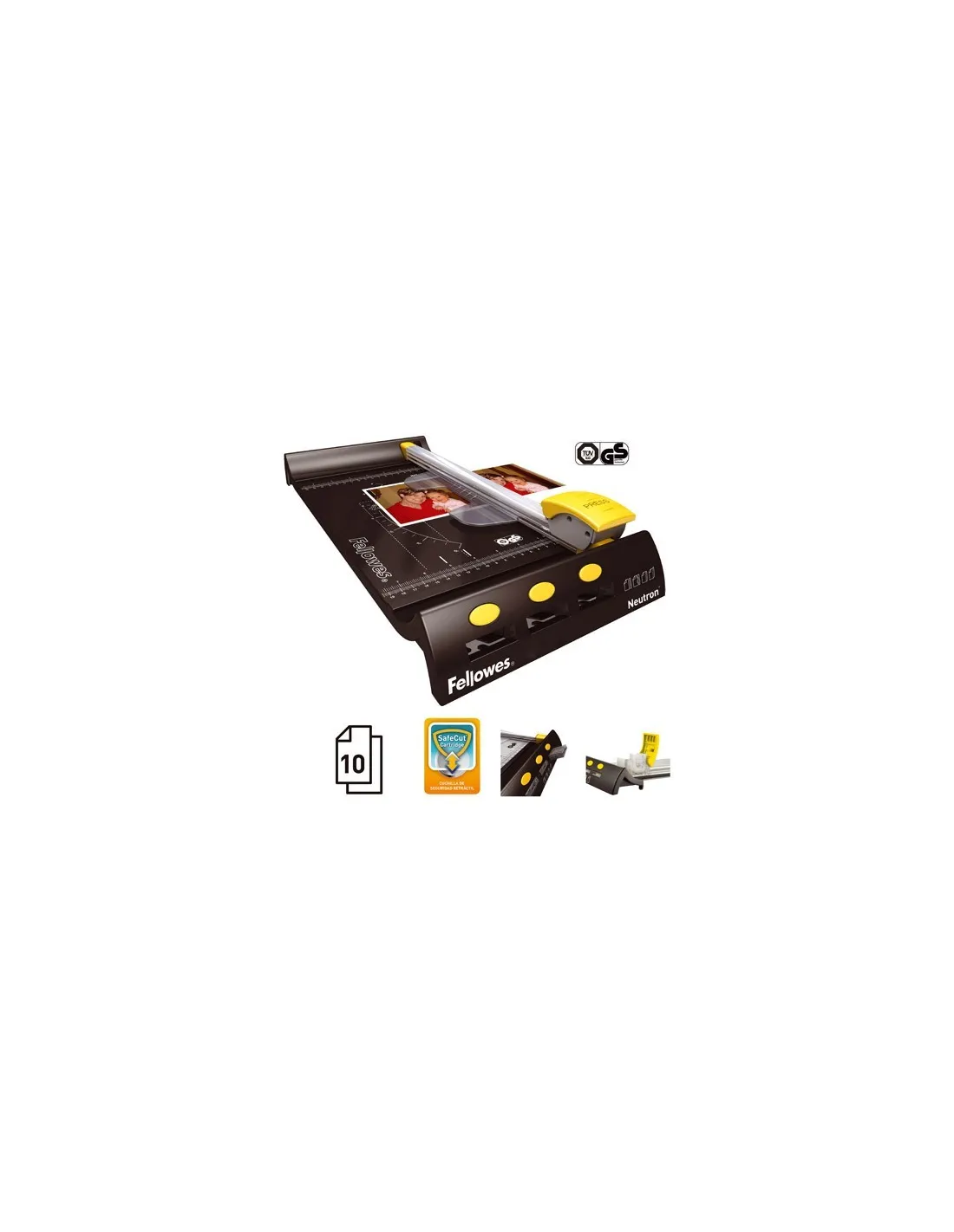 Mecanismo de corte con sistema de seguridad que mantiene la cuchilla en el interior del cabezal hasta que se va a efectuar el corte. Cizalla de rodillo. Para 10h. Longitud de corte 32cm. Banda de corte de larga duración. 230x95x495 cm.1kg.Cizalla neutron Fellowes A4