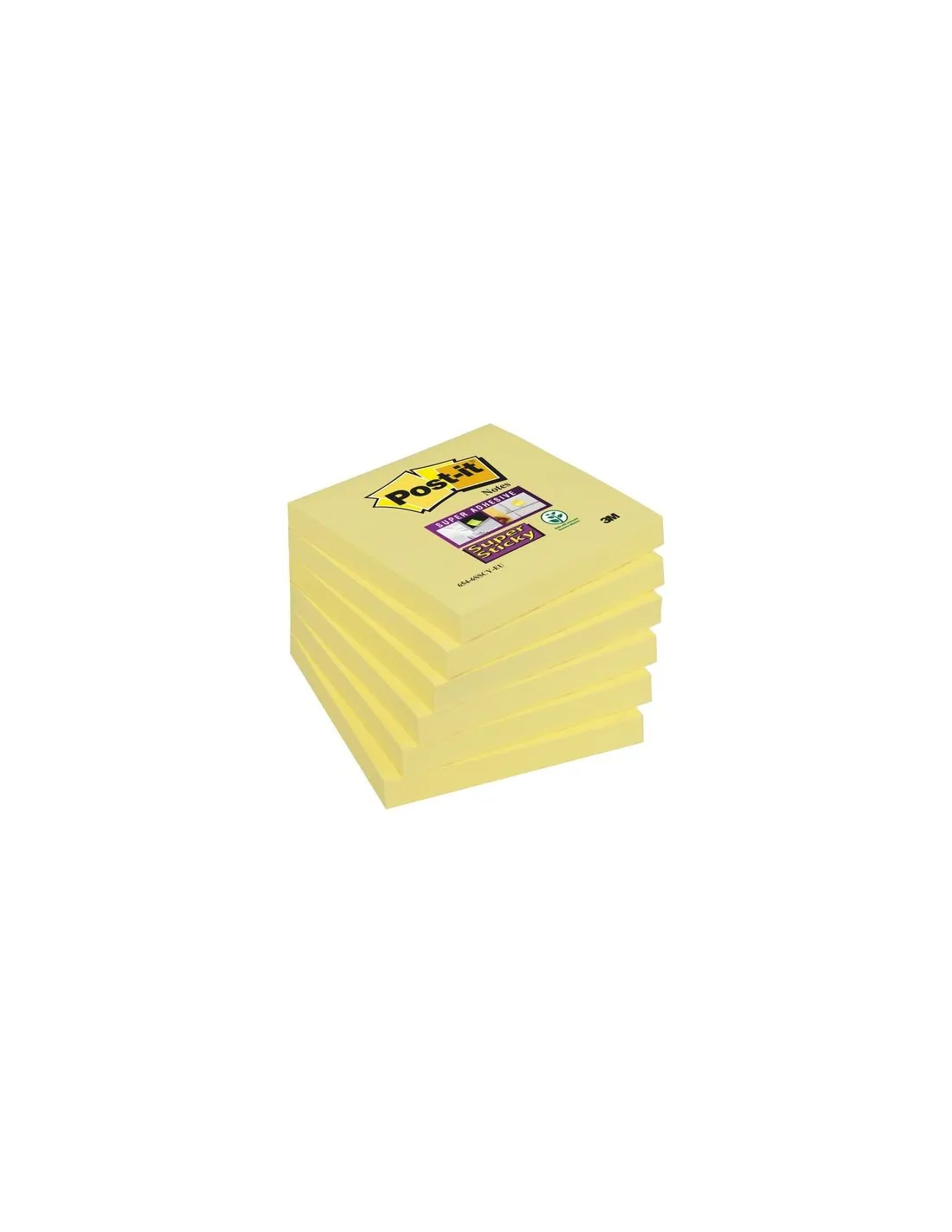 Notas Super Sticky con una banda adhesiva, resposicionable a voluntad. Se adhiere mejor y por más tiempo a cualquier tipo de superficie. Blocs de 90 hojas en 3 formatos distintos.Bloc notas adhesivas Post-it amarillo 76x76 superstick