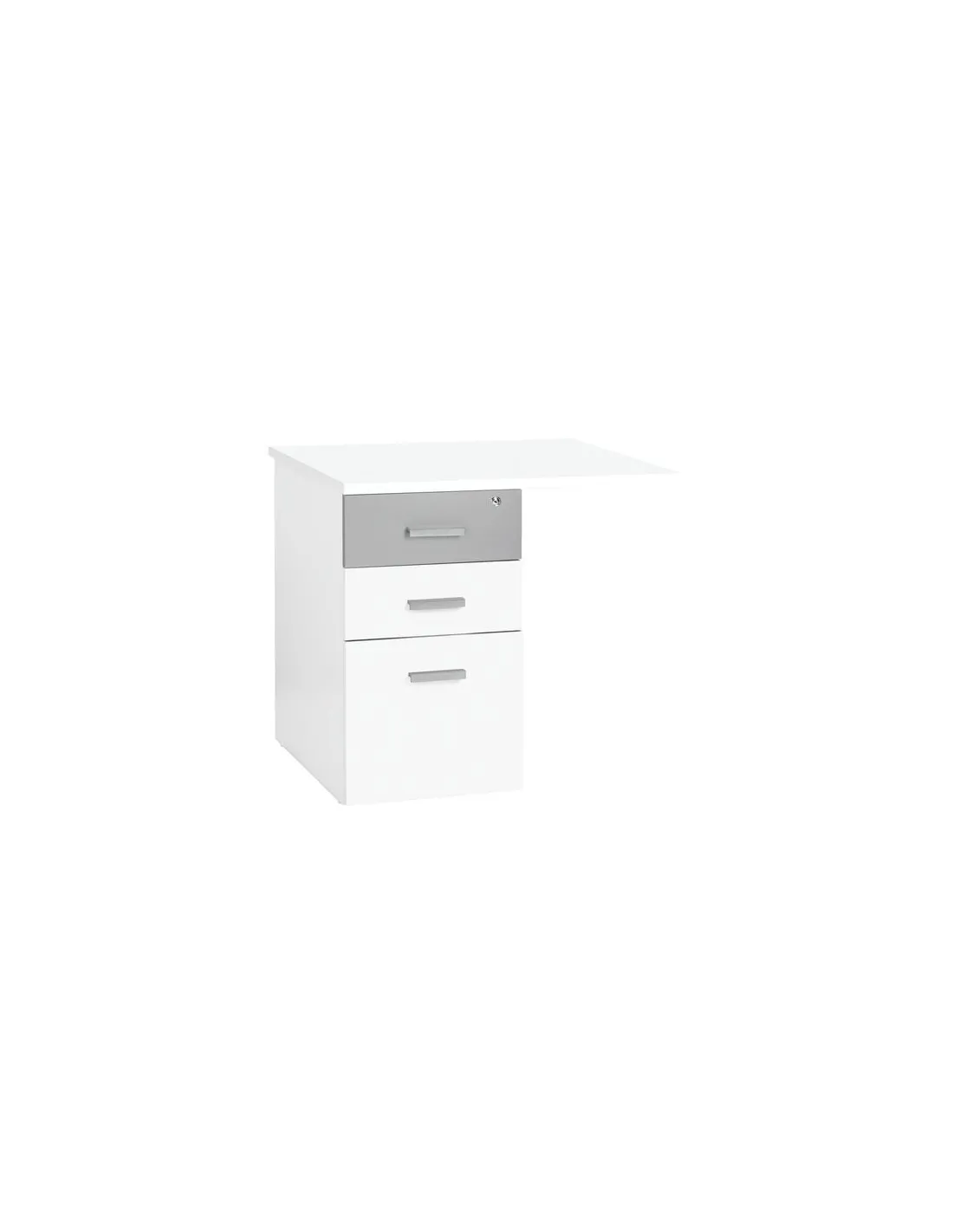 Estructura: tablero paneles de particulas con revestimiento melaminado grosor 25 mm. Cantos rectos antichoque grosor 2mm. Cajonera con 3 cajones ( 2 de clasificación + 1 para carpetas colgantes) (blanco, verde o aluminio). 3 colores disponibles para el cajón superior ( blanco, verde o Alu). Tirador de plastico color aluminio. Medidas: An 80 x Fon 60 x Alt 72,5 cm.Ala mesa cajonera intuitiv blanco-aluminio