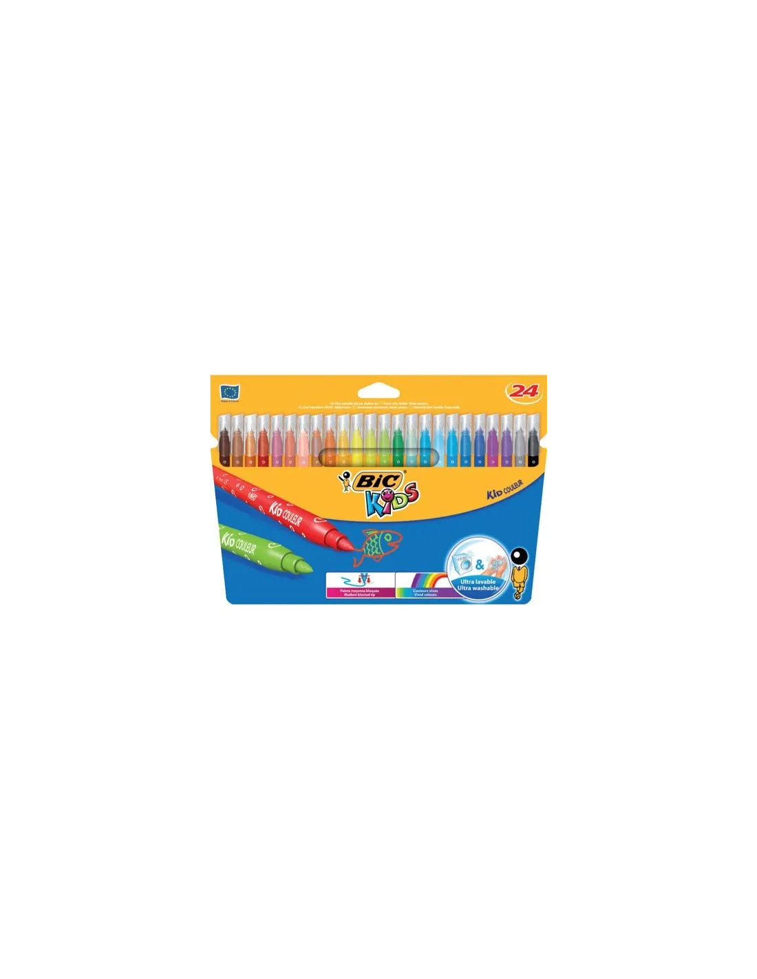 KID COULEUR Rotuladores de punta media ultralavables. Ideales para colorear y dibujar a diario.Tinta ultralavable que sale fácilmente de la piel y de la mayor parte de la ropa. Punta bloqueada, resistente a la presión Colores vivos Buena resistencia de la punta A partir de 5 años. Punta mediana Ø 2,8 mm. Tinta con base de agua Tapón ventilado Producto conforme a la Norma Europea relativa a la Seguridad de los juguetes (EN71), probado anualmente por un laboratorio independienteRotuladores de colores Bic Kids Estuche de 24 Rotuladores lavables. Punta media y muy resistentes. Surtido de 24 colores
